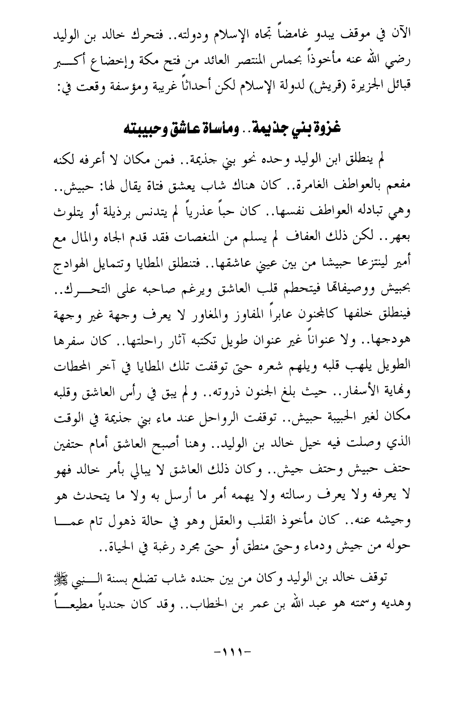 لم ينطلق ابن الوليد وحده نحو بني جذيمة .. فمن مكان لا أعرفه لكنه مفعم بالعواطف الغامرة .. كان هناك شاب يعشق فتاة يقال لها: حبيش .. وهي تبادله العواطف نفسها .. كان حبًا عذريًا لم يتدنس برذيلة أو يتلوث بعهر .. لكن ذلك العفاف لم يسلم من المنغصات فقد قدم الجاه والمال مع أمير لينتزعا حبيشا من بين عيني عاشقها .. فتنطلق المطايا وتتمايل الهوادج بحبيش ووصيفاتها فيتحطم قلب العاشق ويرغم صاحبه على التحرك .. فينطلق خلفها كالمجنون عابرًا المفاوز والمغاور لا يعرف وجهة غير وجهة هودجها .. ولا عنوانًا غير عنوان طويل تكتبه آثار راحلتها .. كان سفرها الطويل يلهب قلبه ويلهم شعره حتى توقفت تلك المطايا في آخر المحطات ونهاية الأسفار .. حيث بلغ الجنون ذروته .. ولم يبق في رأس العاشق وقلبه مكان لغير الحبيبة حبيش .. توقفت الرواحل عند ماء بني جذيمة في الوقت الذي وصلت فيه خيل خالد بن الوليد .. وهنا أصبح العاشق أمام حتفين حتف حبيش وحتف جيش .. وكان ذلك العاشق لا يبالي بأمر خالد فهو لا يعرفه ولا يعرف رسالته ولا يهمه أمر ما أرسل به ولا ما يتحدث هو وجيشه عنه .. كان مأخوذ القلب والعقل وهو في حالة ذهول تام عما حوله من جيش ودماء وحتى منطق أو حتى مجرد رغبة في الحياة ..