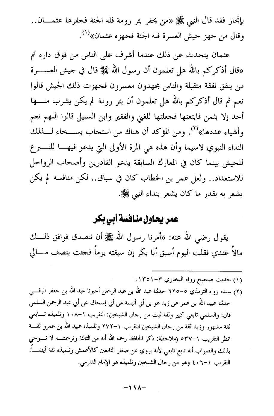 عثمان يتحدث عن ذلك عندما أشرف على الناس من فوق داره ثم "قال أذكركم بالله هل تعلمون أن رسول الله - صلى الله عليه وسلم - قال في جيش العسرة من ينفق نفقة متقبلة والناس مجهدون معسرون فجهزت ذلك الجيش قالوا نعم ثم قال أذكركم بالله هل تعلمون أن بئر رومة لم يكن يشرب منها أحد إلا بثمن فابتعتها فجعلتها للغني والفقير وابن السبيل قالوا اللَّهم نعم وأشياء عددها" (¬2). ومن المؤكد أن هناك من استجاب بسخاء لذلك النداء النبوي لا سيما وأن هذه هي المرة الأولى التي يدعو فيها للتبرع للجيش بينما كان في المعارك السابقة يدعو القادرين وأصحاب الرواحل للاستعداد .. ولعل عمر بن الخطاب كان في سباق .. لكن منافسه لم يكن يشعر به بقدر ما كان يشعر بنداء النبي - صلى الله عليه وسلم -.