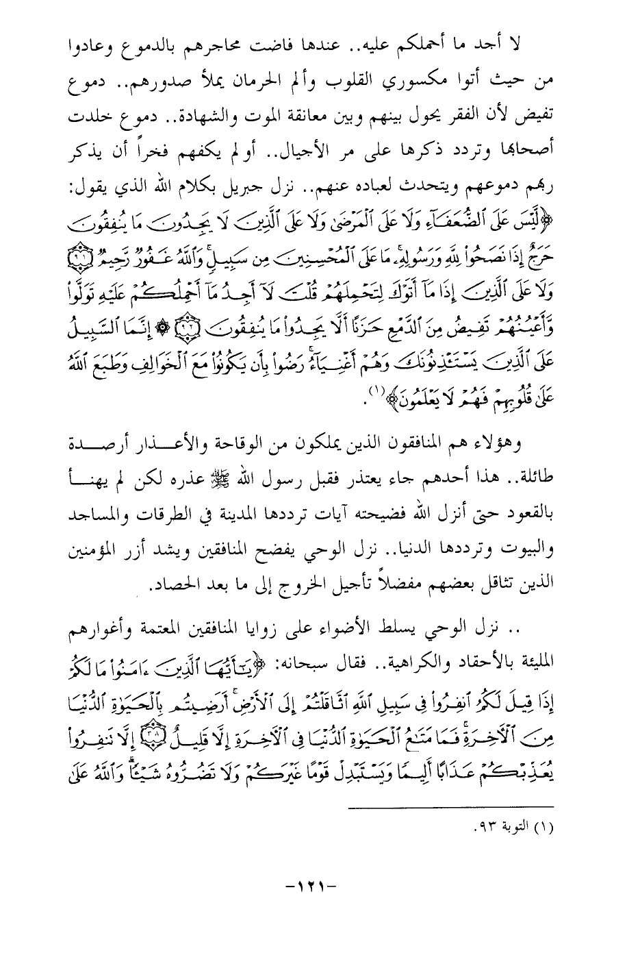 لا أجد ما أحملكم عليه .. عندها فاضت محاجرهم بالدموع وعادوا من حيث أتوا مكسوري القلوب وألم الحرمان يملأ صدورهم .. دموع تفيض لأن الفقر يحول بينهم وبن معانقة الموت والشهادة .. دموع خلدت أصحابا وتردد ذكرها على مر الأجيال .. أولم يكفهم فخرًا أن يذكر ربهم دموعهم ويتحدث لعباده عنهم .. نزل جبريل بكلام الله الذي يقول: {لَيْسَ عَلَى الضُّعَفَاءِ وَلَا عَلَى الْمَرْضَى وَلَا عَلَى الَّذِينَ لَا يَجِدُونَ مَا يُنْفِقُونَ حَرَجٌ إِذَا نَصَحُوا لِلَّهِ وَرَسُولِهِ مَا عَلَى الْمُحْسِنِينَ مِنْ سَبِيلٍ وَاللَّهُ غَفُورٌ رَحِيمٌ (91) وَلَا عَلَى الَّذِينَ إِذَا مَا أَتَوْكَ لِتَحْمِلَهُمْ قُلْتَ لَا أَجِدُ مَا أَحْمِلُكُمْ عَلَيْهِ تَوَلَّوْا وَأَعْيُنُهُمْ تَفِيضُ مِنَ الدَّمْعِ حَزَنًا أَلَّا يَجِدُوا مَا يُنْفِقُونَ (92) إِنَّمَا السَّبِيلُ عَلَى الَّذِينَ يَسْتَأْذِنُونَكَ وَهُمْ أَغْنِيَاءُ رَضُوا بِأَنْ يَكُونُوا مَعَ الْخَوَالِفِ وَطَبَعَ اللَّهُ عَلَى قُلُوبِهِمْ فَهُمْ لَا يَعْلَمُونَ} (¬1).
