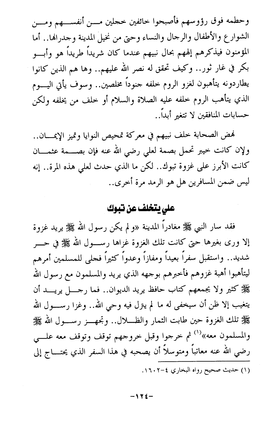فقد سار النبي - صلى الله عليه وسلم - مغادرًا المدينة "ولم يكن رسول الله - صلى الله عليه وسلم - يريد غزوة إلا ورى بغيرها حتى كانت تلك الغزوة غزاها رسول الله - صلى الله عليه وسلم - في حر شديد .. واستقبل سفرًا بعيدًا ومفازًا وعدوًا كثيرًا فجلى للمسلمين أمرهم ليتأهبوا أهبة غزوهم فأخبرهم بوجهه الذي يريد والمسلمون مع رسول الله - صلى الله عليه وسلم - كثير ولا يجمعهم كتاب حافظ يريد الديوان .. فما رجل يريد أن يتغيب إلا ظن أن سيخفى له ما لم ينزل فيه وحي الله .. وغزا رسول الله - صلى الله عليه وسلم - تلك الغزوة حين طابت الثمار والظلال .. وتجهز رسول الله - صلى الله عليه وسلم - والمسلمون معه" (¬1) ثم خرجوا وقبل خروجهم توقف وتوقف معه علي رضي الله عنه معاتبًا ومتوسلًا أن يصحبه في هذا السفر الذي يحتاج إلى
