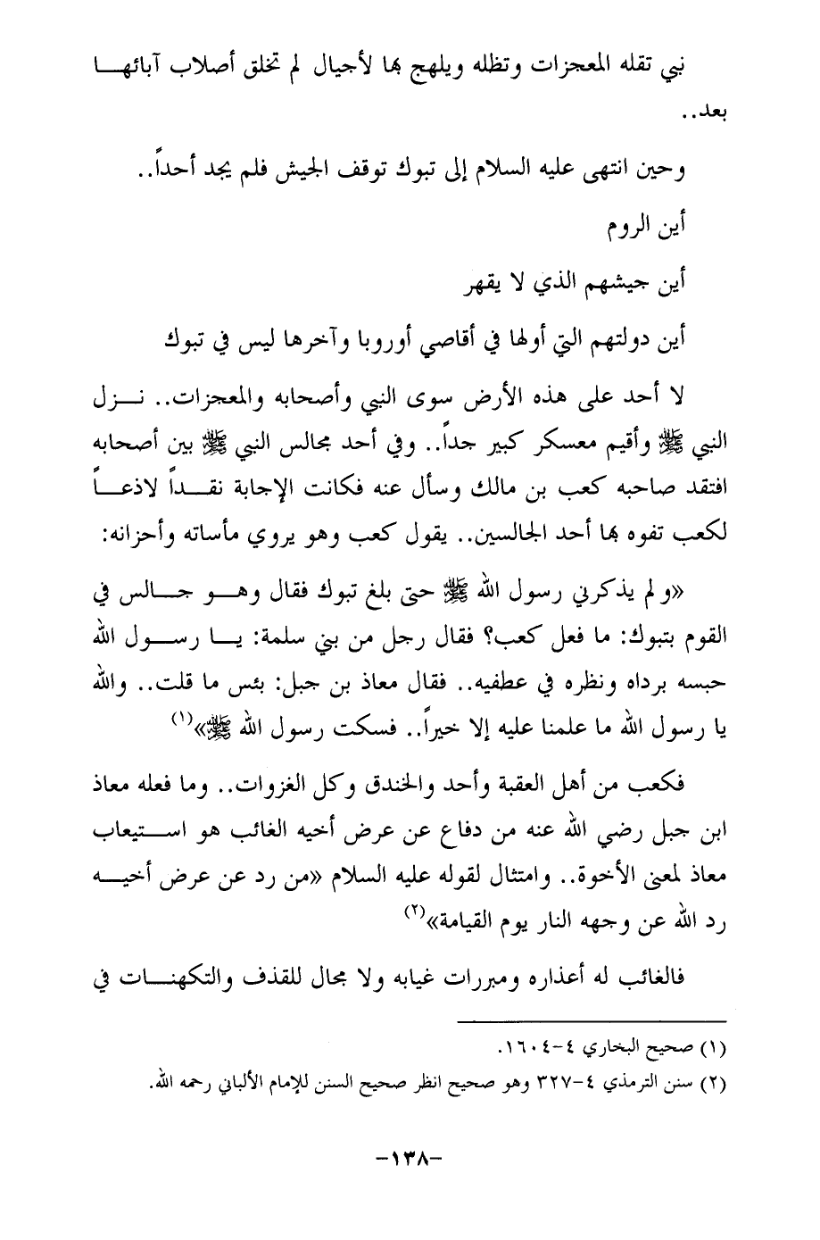 "ولم يذكرني رسول الله - صلى الله عليه وسلم - حتى بلغ تبوك فقال وهو جالس في القوم بتبوك: ما فعل كعب؟ فقال رجل من بني سلمة: يا رسول الله حبسه برداه ونظره في عطفيه .. فقال معاذ بن جبل: بئس ما قلت .. والله يا رسول الله ما علمنا عليه إلا خيرًا .. فسكت رسول الله - صلى الله عليه وسلم -" (¬1)