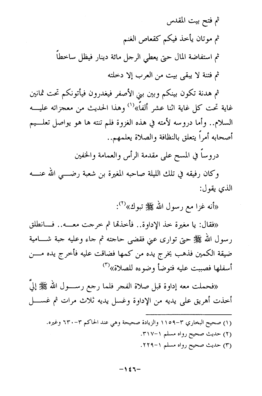 ثم هدنة تكون بينكم وبين بني الأصفر فيغدرون فيأتونكم تحت ثمانين غاية تحت كل غاية اثنا عشر ألفًا" (¬1) وهذا الحديث من معجزاته عليه السلام .. وأما دروسه لأمته في هذه الغزوة فلم تنته ها هو يواصل تعليم أصحابه أمرًا يتعلق بالنظافة والصلاة يعلمهم ..