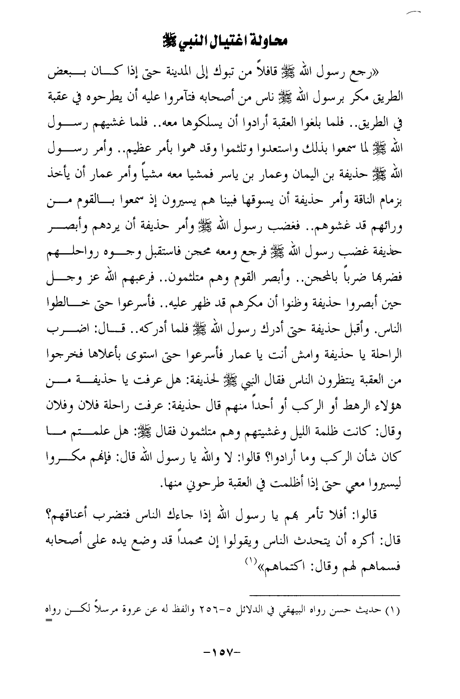 " رجع رسول الله - صلى الله عليه وسلم - قافلًا من تبوك إلى المدينة حتى إذا كان ببعض الطريق مكر برسول الله - صلى الله عليه وسلم - ناس من أصحابه فتآمروا عليه أن يطرحوه في عقبة في الطريق .. فلما بلغوا العقبة أرادوا أن يسلكوها معه .. فلما غشيهم رسول الله - صلى الله عليه وسلم - لما سمعوا بذلك واستعدوا وتلثموا وقد هموا بأمر عظيم .. وأمر رسول الله - صلى الله عليه وسلم - حذيفة بن اليمان وعمار بن ياسر فمشيا معه مشيًا وأمر عمار أن يأخذ بزمام الناقة وأمر حذيفة أن يسوقها فبينا هم يسيرون إذ سمعوا بالقوم من ورائهم قد غشوهم .. فغضب رسول الله - صلى الله عليه وسلم - وأمر حذيفة أن يردهم وأبصر حذيفة غضب رسول الله - صلى الله عليه وسلم - فرجع ومعه محجن فاستقبل وجوه رواحلهم فضربها ضربًا بالمحجن .. وأبصر القوم وهم متلثمون .. فرعبهم الله عَزَّ وجَلَّ حين أبصروا حذيفة وظنوا أن مكرهم قد ظهر عليه .. فأسرعوا حتى خالطوا الناس. وأقبل حذيفة حتى أدرك رسول الله - صلى الله عليه وسلم - فلما أدركه .. قال: اضرب الراحلة يا حذيفة وامش أنت يا عمار فأسرعوا حتى استوى بأعلاها فخرجوا من العقبة ينتظرون الناس فقال النبي - صلى الله عليه وسلم - لحذيفة: هل عرفت يا حذيفة من هؤلاء الرهط أو الركب أو أحدًا منهم قال حذيفة: عرفت راحلة فلان وفلان وقال: كانت ظلمة الليل وغشيتهم وهم متلثمون فقال - صلى الله عليه وسلم -: هل علمتم ما كان شأن الركب وما أرادوا؟ قالوا: لا والله يا رسول الله قال: فإنهم مكروا ليسيروا معي حتى إذا أظلمت في العقبة طرحوني منها.