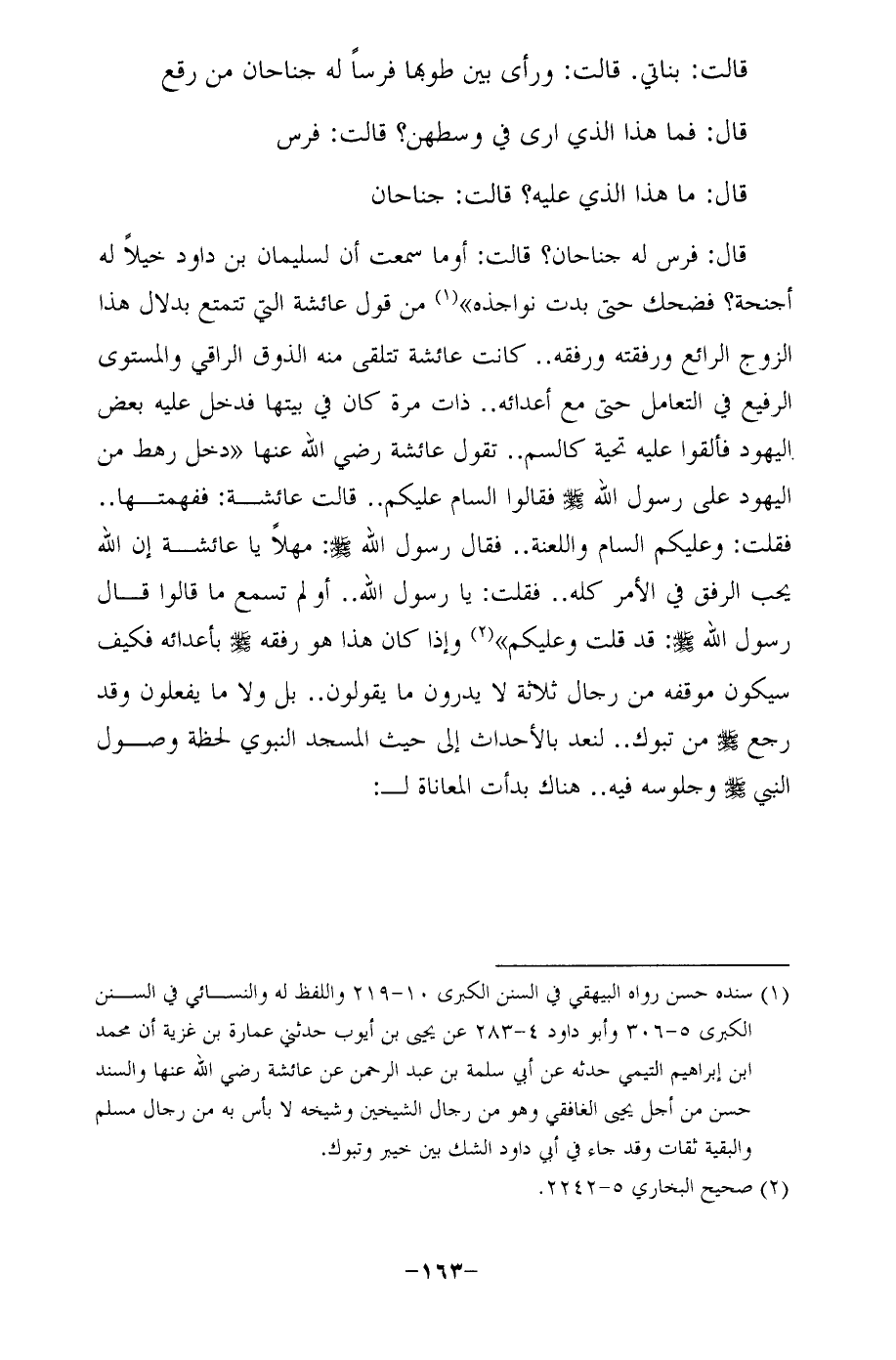 قال: فرس له جناحان؟ قالت: أوما سمعت أن لسليمان بن داود خيلًا له أجنحة؟ فضحك حتى بدت نواجده" (¬1) من قول عائشة إلى تتمتع بدلال هذا الزوج الرائع ورفقته ورفقه .. كانت عائشة تتلقى منه الذوق الراقي والمستوى الرفيع في التعامل حتى مع أعدائه .. ذات مرة كان في بيتها فدخل عليه بعض اليهود فألقوا عليه تحية كالسم .. تقول عائشة رضي الله عنها "دخل رهط من اليهود على رسول الله - صلى الله عليه وسلم - فقالوا السام عليكم .. قالت عائشة: ففهمتها .. فقلت: وعليكم السام واللعنة .. فقال رسول الله - صلى الله عليه وسلم -: مهلًا يا عائشة إن الله يحب الرفق في الأمر كله .. فقلت: يا رسول الله .. أولم تسمع ما قالوا قال رسول الله - صلى الله عليه وسلم -: قد قلت وعليكم" (¬2) وإذا كان هذا هو رفقه - صلى الله عليه وسلم - بأعدائه فكيف سيكون موقفه من رجال ثلاثة لا يدرون ما يقولون .. بل ولا ما يفعلون وقد رجع - صلى الله عليه وسلم - من تبوك .. لنعد بالأحداث إلى حيث المسجد النبوي لحظة وصول النبي - صلى الله عليه وسلم - وجلوسه فيه .. هناك بدأت المعاناة لـ:
