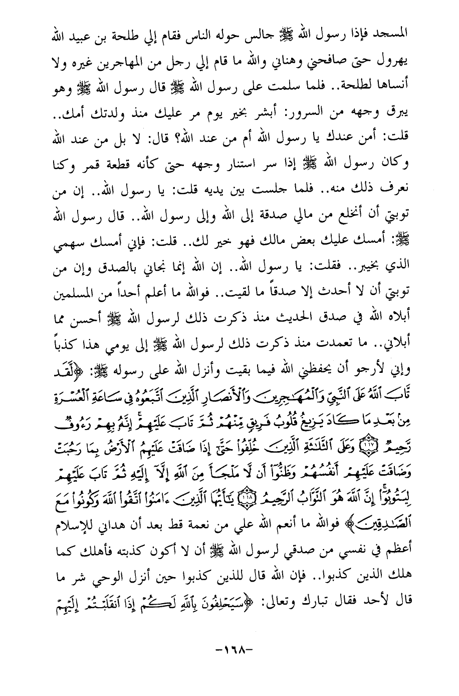 المسجد فإذا رسول الله - صلى الله عليه وسلم - جالس حوله الناس فقام إلي طلحة بن عبيد الله يهرول حتى صافحني وهناني والله ما قام إلي رجل من المهاجرين غيره ولا أنساها لطلحة .. فلما سلمت على رسول الله - صلى الله عليه وسلم - قال رسول الله - صلى الله عليه وسلم - وهو يبرق وجهه من السرور: أبشر بخير يوم مر عليك منذ ولدتك أمك .. قلت: أمن عندك يا رسول الله أم من عند الله؟ قال: لا بل من عند الله وكان رسول الله - صلى الله عليه وسلم - إذا سر استنار وجهه حتى كأنه قطعة قمر وكنا نعرف ذلك منه .. فلما جلست بين يديه قلت: يا رسول الله .. إن من توبتي أن أنخلع من مالي صدقة إلى الله وإلى رسول الله .. قال رسول الله - صلى الله عليه وسلم -: أمسك عليك بعض مالك فهو خير لك .. قلت: فإني أمسك سهمى الذي بخيبر .. فقلت: يا رسول الله .. إن الله إنما نجاني بالصدق وإن من توبتي أن لا أحدث إلا صدقًا ما لقيت .. فوالله ما أعلم أحدًا من المسلمين أبلاه الله في صدق الحديث منذ ذكرت ذلك لرسول الله - صلى الله عليه وسلم - أحسن مما أبلاني .. ما تعمدت منذ ذكرت ذلك لرسول الله - صلى الله عليه وسلم - إلى يومي هذا كذبًا وإني لأرجو أن يحفظني الله فيما بقيت وأنزل الله على رسوله - صلى الله عليه وسلم -: {لَقَدْ تَابَ اللَّهُ عَلَى النَّبِيِّ وَالْمُهَاجِرِينَ وَالْأَنْصَارِ الَّذِينَ اتَّبَعُوهُ فِي سَاعَةِ الْعُسْرَةِ مِنْ بَعْدِ مَا كَادَ يَزِيغُ قُلُوبُ فَرِيقٍ مِنْهُمْ ثُمَّ تَابَ عَلَيْهِمْ إِنَّهُ بِهِمْ رَءُوفٌ رَحِيمٌ (117) وَعَلَى الثَّلَاثَةِ الَّذِينَ خُلِّفُوا حَتَّى إِذَا ضَاقَتْ عَلَيْهِمُ الْأَرْضُ بِمَا رَحُبَتْ وَضَاقَتْ عَلَيْهِمْ أَنْفُسُهُمْ وَظَنُّوا أَنْ لَا مَلْجَأَ مِنَ اللَّهِ إِلَّا إِلَيْهِ ثُمَّ تَابَ عَلَيْهِمْ لِيَتُوبُوا إِنَّ اللَّهَ هُوَ التَّوَّابُ الرَّحِيمُ (118) يَا أَيُّهَا الَّذِينَ آمَنُوا اتَّقُوا اللَّهَ وَكُونُوا مَعَ الصَّادِقِينَ} فوالله ما أنعم الله علي من نعمة قط بعد أن هداني للإسلام أعظم في نفسي من صدقي لرسول الله - صلى الله عليه وسلم - أن لا أكون كذبته فأهلك كما هلك الذين كذبوا .. فإن الله قال للذين كذبوا حين أنزل الوحي شر ما قال لأحد فقال تبارك وتعالى: {سَيَحْلِفُونَ بِاللَّهِ لَكُمْ إِذَا انْقَلَبْتُمْ إِلَيْهِمْ