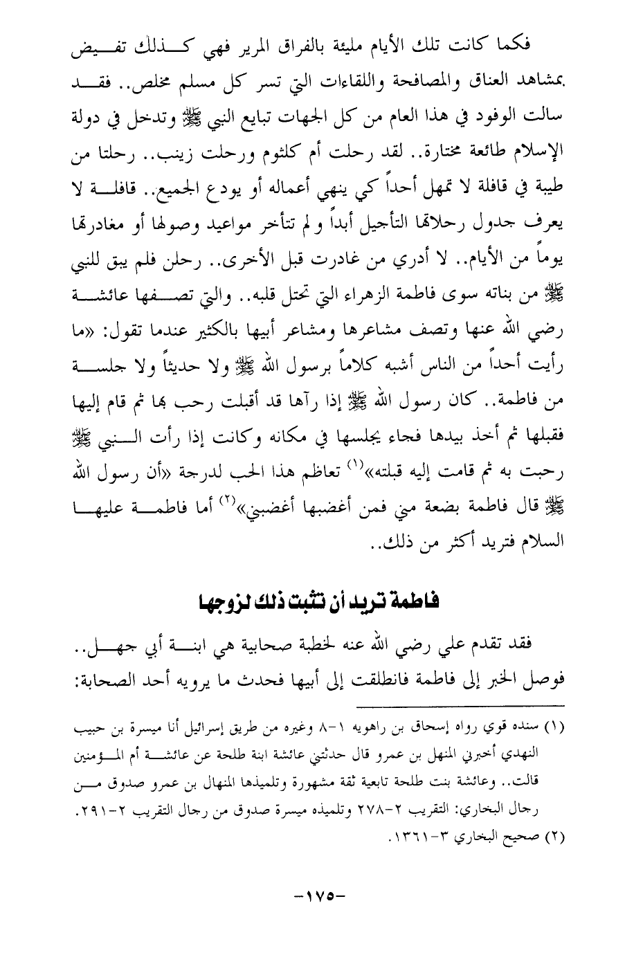 فكما كانت تلك الأيام مليئة بالفراق المرير فهي كذلك تفيض بمشاهد العناق والمصافحة واللقاءات التي تسر كل مسلم مخلص .. فقد سالت الوفود في هذا العام من كل الجهات تبايع النبي - صلى الله عليه وسلم - وتدخل في دولة الإِسلام طائعة مختارة .. لقد رحلت أم كلثوم ورحلت زينب .. رحلتا من طيبة في قافلة لا تمهل أحدًا كي ينهي أعماله أو يودع الجميع .. قافلة لا يعرف جدول رحلاتها التأجيل أبدًا ولم تتأخر مواعيد وصولها أو مغادرتها يومًا من الأيام .. لا أدري من غادرت قبل الأخرى .. رحلن فلم يبق للنبي - صلى الله عليه وسلم - من بناته سوى فاطمة الزهراء التي تحتل قلبه .. والتي تصفها عائشة رضي الله عنها وتصف مشاعرها ومشاعر أبيها بالكثير عندما تقول: "ما رأيت أحدًا من الناس أشبه كلامًا برسول الله - صلى الله عليه وسلم - ولا حديثًا ولا جلسة من فاطمة .. كان رسول الله - صلى الله عليه وسلم - إذا رآها قد أقبلت رحب بها ثم قام إليها فقبلها ثم أخذ بيدها فجاء يجلسها في مكانه وكانت إذا رأت النبي - صلى الله عليه وسلم - رحبت به ثم قامت إليه قبلته" (¬1) تعاظم هذا الحب لدرجة "أن رسول الله - صلى الله عليه وسلم - قال فاطمة بضعة مني فمن أغضبها أغضبني" (¬2) أما فاطمة عليها السلام فتريد أكثر من ذلك ..