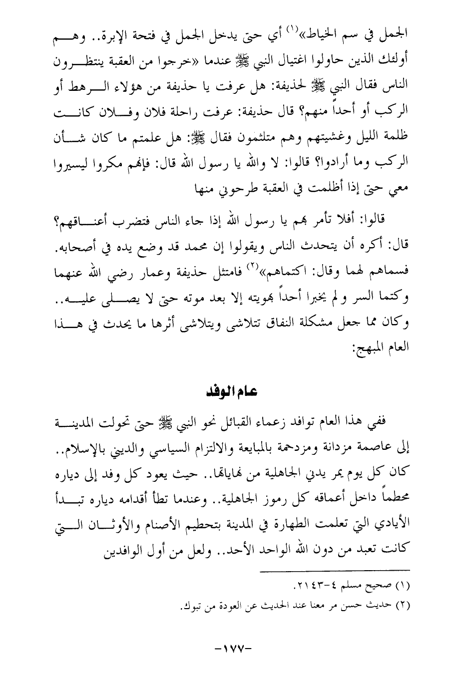 الجمل في سم الخياط" (¬1) أي حتى يدخل الجمل في فتحة الإبرة .. وهم أولئك الذين حاولوا اغتيال النبي - صلى الله عليه وسلم - عندما "خرجوا من العقبة ينتظرون الناس فقال النبي - صلى الله عليه وسلم - لحذيفة: هل عرفت يا حذيفة من هؤلاء الرهط أو الركب أو أحدًا منهم؟ قال حذيفة: عرفت راحلة فلان وفلان كانت ظلمة الليل وغشيتهم وهم متلثمون فقال - صلى الله عليه وسلم -: هل علمتم ما كان شأن الركب وما أرادوا؟ قالوا: لا والله يا رسول الله قال: فإنهم مكروا ليسيروا معي حتى إذا أظلمت في العقبة طرحوني منها