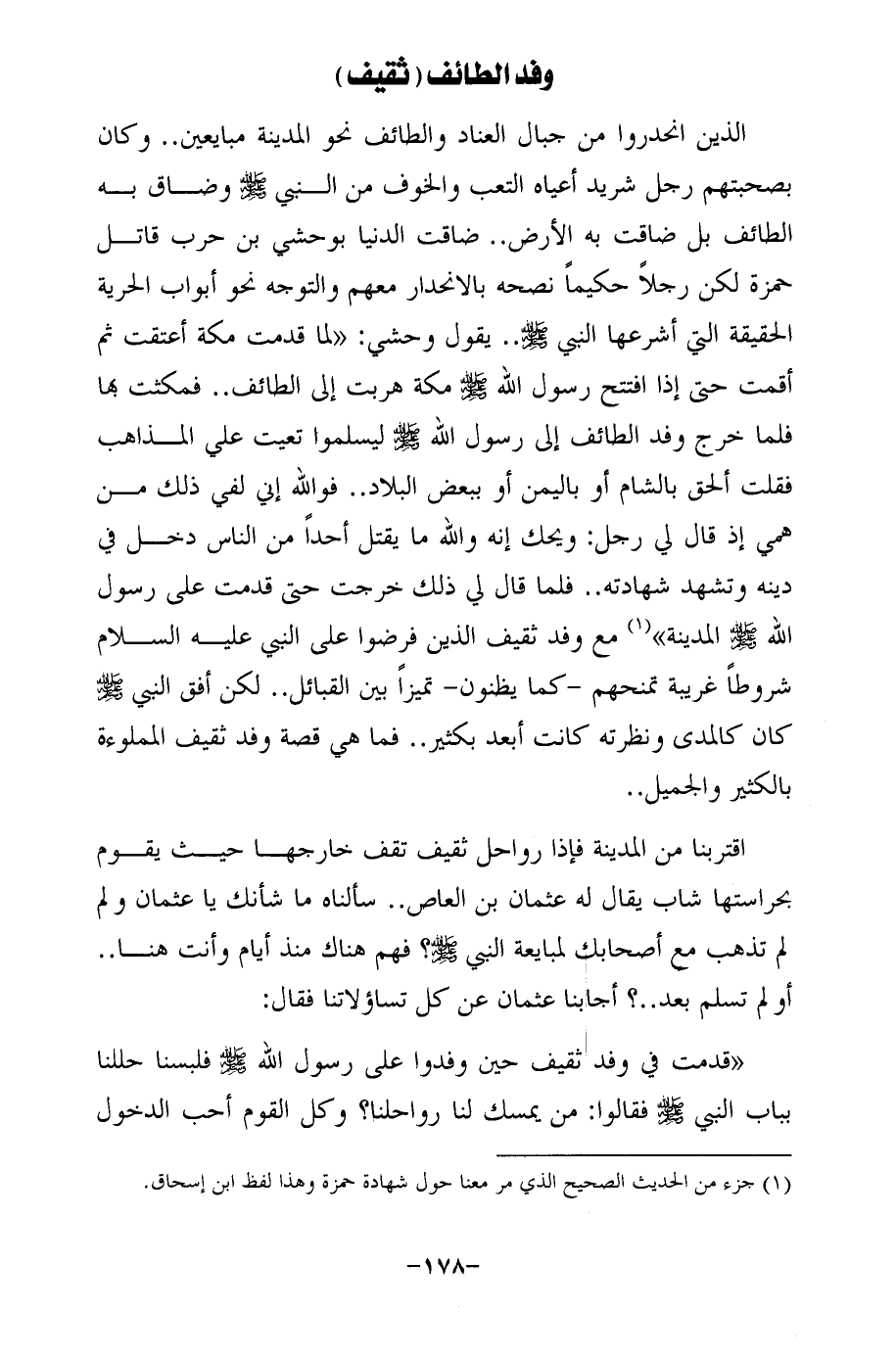 الذين انحدروا من جبال العناد والطائف نحو المدينة مبايعين .. وكان بصحبتهم رجل شريد أعياه التعب والخوف من النبي - صلى الله عليه وسلم - وضاق به الطائف بل ضاقت به الأرض .. ضاقت الدنيا بوحشي بن حرب قاتل حمزة لكن رجلًا حكيمًا نصحه بالانحدار معهم والتوجه نحو أبواب الحرية الحقيقة التي أشرعها النبي - صلى الله عليه وسلم - .. يقول وحشي: "لما قدمت مكة أعتقت ثم أقمت حتى إذا افتتح رسول الله - صلى الله عليه وسلم - مكة هربت إلى الطائف .. فمكثت بها فلما خرج وفد الطائف إلى رسول الله - صلى الله عليه وسلم - ليسلموا تعيت علي المذاهب فقلت ألحق بالشام أو باليمن أو ببعض البلاد .. فوالله إني لفي ذلك من همي إذ قال لي رجل: ويحك إنه والله ما يقتل أحدًا من الناس دخل في دينه وتشهد شهادته .. فلما قال لي ذلك خرجت حتى قدمت على رسول الله - صلى الله عليه وسلم - المدينة" (¬1) مع وفد ثقيف الذين فرضوا على النبي عليه السلام شروطًا غريبة تمنحهم -كما يظنون- تميزًا بين القبائل .. لكن أفق النبي - صلى الله عليه وسلم - كان كالمدى ونظرته كانت أبعد بكثير .. فما هي قصة وفد ثقيف المملوءة بالكثير والجميل ..
