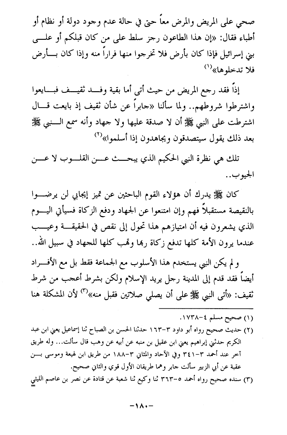 صحي على المريض والمرض معًا حتى في حالة عدم وجود دولة أو نظام أو أطباء فقال: "إن هذا الطاعون رجز سلط على من كان قبلكم أو على بني إسرائيل فإذا كان بأرض فلا تخرجوا منها فرارًا منه وإذا كان بأرض فلا تدخلوها" (¬1)