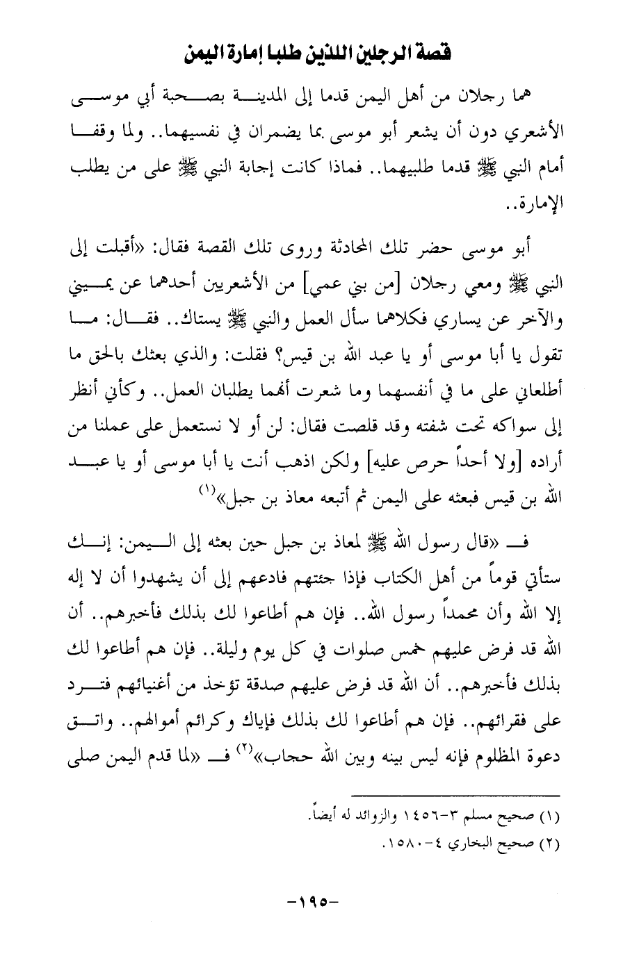 هما رجلان من أهل اليمن قدما إلى المدينة بصحبة أبي موسى الأشعري دون أن يشعر أبو موسى بما يضمران في نفسيهما .. ولما وقفا أمام النبي - صلى الله عليه وسلم - قدما طلبيهما .. فماذا كانت إجابة النبي - صلى الله عليه وسلم - على من يطلب الإمارة ..