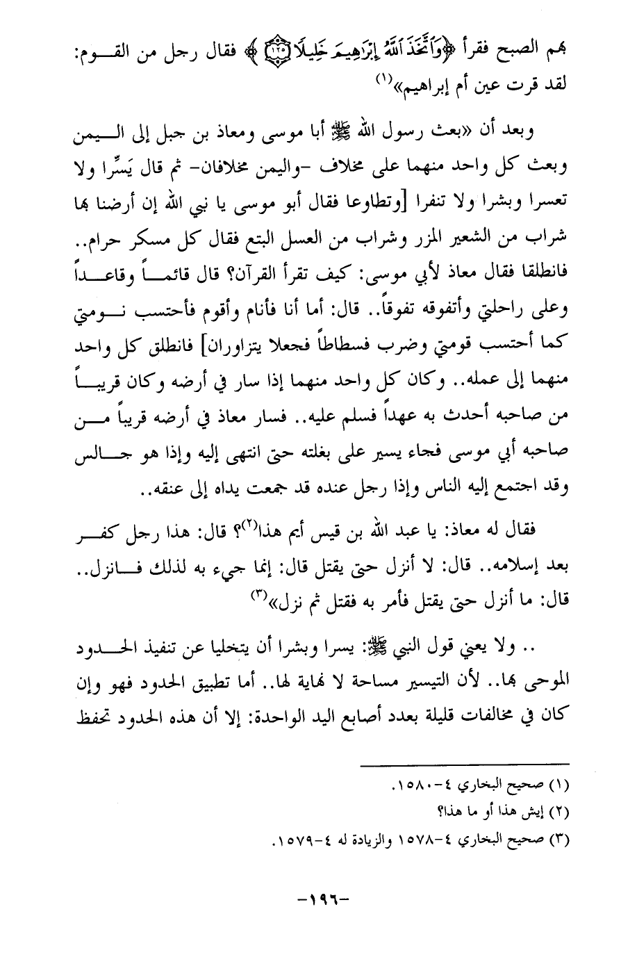 وبعد أن "بعث رسول الله - صلى الله عليه وسلم - أبا موسى ومعاذ بن جبل إلى اليمن وبعث كل واحد منهما على مخلاف -واليمن مخلافان- ثم قال يَسِّرا ولا تعسرا وبشرا ولا تنفرا [وتطاوعا فقال أبو موسى يا نبي الله إن أرضنا بها شراب من الشعير المزر وشراب من العسل البتع فقال كل مسكر حرام .. فانطلقا فقال معاذ لأبي موسى: كيف تقرأ القرآن؟ قال قائمًا وقاعدًا وعلى راحلتي وأتفوقه تفوقًا .. قال: أما أنا فأنام وأقوم فأحتسب نومتي كما أحتسب قومتي وضرب فسطاطًا فجعلا يتزاوران] فانطلق كل واحد منهما إلى عمله .. وكان كل واحد منهما إذا سار في أرضه وكان قريبًا من صاحبه أحدث به عهدًا فسلم عليه .. فسار معاذ في أرضه قريبًا من صاحبه أبي موسى فجاء يسير على بغلته حتى انتهى إليه وإذا هو جالس وقد اجتمع إليه الناس وإذا رجل عنده قد جمعت يداه إلى عنقه ..