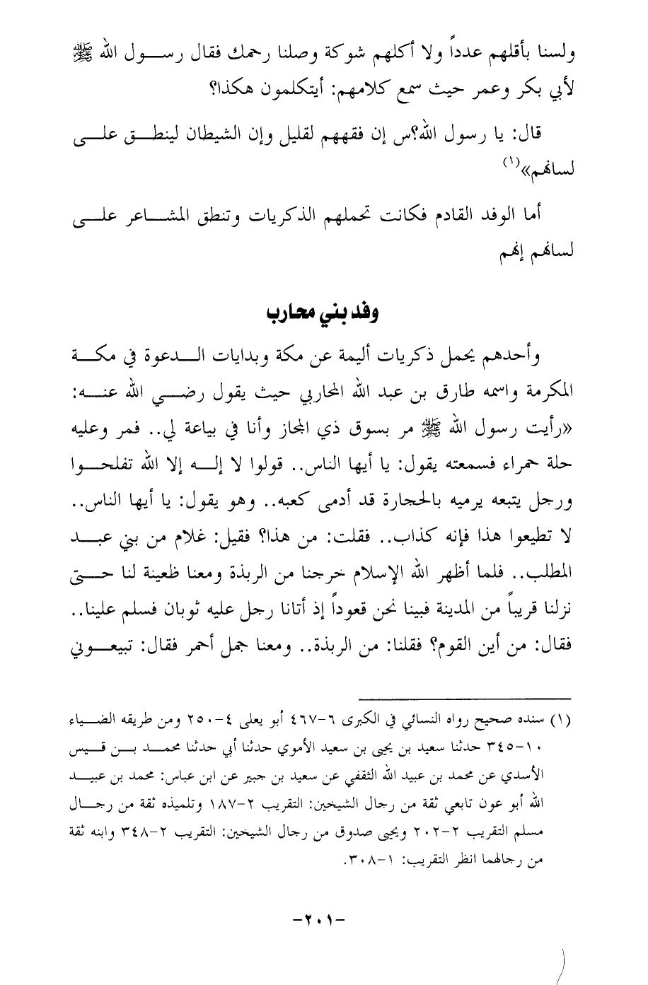 وأحدهم يحمل ذكريات أليمة عن مكة وبدايات الدعوة في مكة المكرمة واسمه طارق بن عبد الله المحاربي حيث يقول رضي الله عنه: "رأيت رسول الله - صلى الله عليه وسلم - مر بسوق ذي المجاز وأنا في بياعة لي .. فمر وعليه حلة حمراء فسمعته يقول: يا أيها الناس .. قولوا لا إله إلا الله تفلحوا ورجل يتبعه يرميه بالحجارة قد أدمى كعبه .. وهو يقول: يا أيها الناس .. لا تطيعوا هذا فإنه كذاب .. فقلت: من هذا؟ فقيل: غلام من بني عبد المطلب .. فلما أظهر الله الإِسلام خرجنا من الربذة ومعنا ظعينة لنا حتى نزلنا قريبًا من المدينة فبينما نحن قعودًا إذ أتانا رجل عليه ثوبان فسلم علينا .. فقال: من أين القوم؟ فقلنا: من الربذة .. ومعنا جمل أحمر فقال: تبيعوني