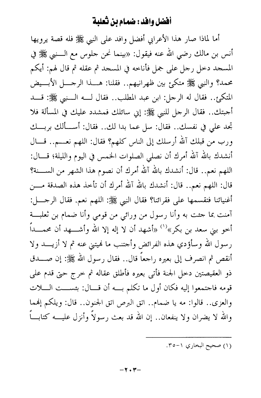 أما لماذا صار هذا الأعرابي أفضل وافد على النبي - صلى الله عليه وسلم - فله قصة يرويها أنس بن مالك رضي الله عنه فيقول: "بينما نحن جلوس مع النبي - صلى الله عليه وسلم - في المسجد دخل رجل على جمل فأناخه في المسجد ثم عقله ثم قال لهم: أيكم محمَّد؟ والنبي - صلى الله عليه وسلم - متكئ بين ظهرانيهم .. فقلنا: هذا الرجل الأبيض المتكئ .. فقال له الرجل: ابن عبد المطلب .. فقال له النبي - صلى الله عليه وسلم -: قد أجبتك .. فقال الرجل للنبي - صلى الله عليه وسلم -: إني سائلك فمشدد عليك في المسألة فلا تجد علي في نفسك .. فقال: سل عما بدا لك .. فقال: أسألك بربك ورب من قبلك آلله أرسلك إلى الناس كلهم؟ فقال: اللَّهم نعم .. قال أنشدك بالله آلله أمرك أن نصلي الصلوات الخمس في اليوم والليلة، قال: اللَّهم نعم .. قال: أنشدك بالله آلله أمرك أن نصوم هذا الشهر من السنة؟ قال: اللَّهم نعم .. قال: أنشدك بالله آلله أمرك أن تأخذ هذه الصدقة من أغنيائنا فتقسمها على فقرائنا؟ فقال النبي - صلى الله عليه وسلم -: اللَّهم نعم. فقال الرجل: آمنت بما جئت به وأنا رسول من ورائي من قومي وأنا ضمام بن ثعلبة أخو بني سعد بن بكر" (¬1) "أشهد أن لا إله إلا الله وأشهد أن محمدًا رسول الله وسأؤدي هذه الفرائض وأجتنب ما نهيتني عنه ثم لا أزيد ولا أنقص ثم انصرف إلى بعيره راجعًا قال .. فقال رسول الله - صلى الله عليه وسلم -: إن صدق ذو العقيصتين دخل الجنة فأتى بعيره فأطلق عقاله ثم خرج حتى قدم على قومه فاجتمعوا إليه فكان أول ما تكلم به أن قال: بئست اللات والعزى .. قالوا: مه يا ضمام .. اتق البرص اتق الجنون .. قال: ويلكم إنهما والله لا يضران ولا ينفعان .. إن الله قد بعث رسولًا وأنزل عليه كتابًا