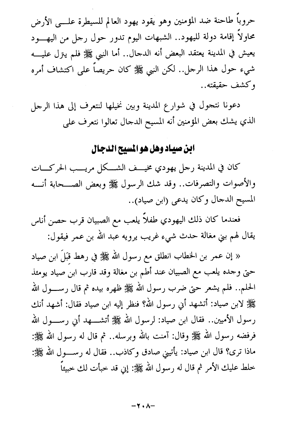"إن عمر بن الخطاب انطلق مع رسول الله - صلى الله عليه وسلم - في رهط قِبَلَ ابن صياد حتى وجده يلعب مع الصبيان عند أطم بن مغالة وقد قارب ابن صياد يومئذ الحلم .. فلم يشعر حتى ضرب رسول الله - صلى الله عليه وسلم - ظهره بيده ثم قال رسول الله - صلى الله عليه وسلم - لابن صياد: أتشهد أني رسول الله؟ فنظر إليه ابن صياد فقال: أشَهد أنك رسول الأميين .. فقال ابن صياد: لرسول الله - صلى الله عليه وسلم - أتشهد أني رسول الله فرفضه رسول الله - صلى الله عليه وسلم - وقال: آمنت بالله وبرسله .. ثم قال له رسول الله - صلى الله عليه وسلم -: ماذا ترى؟ قال ابن صياد: يأتيني صادق وكاذب .. فقال له رسول الله - صلى الله عليه وسلم -: خلط عليك الأمر ثم قال له رسول الله - صلى الله عليه وسلم -: إني قد خبأت لك خبيئًا