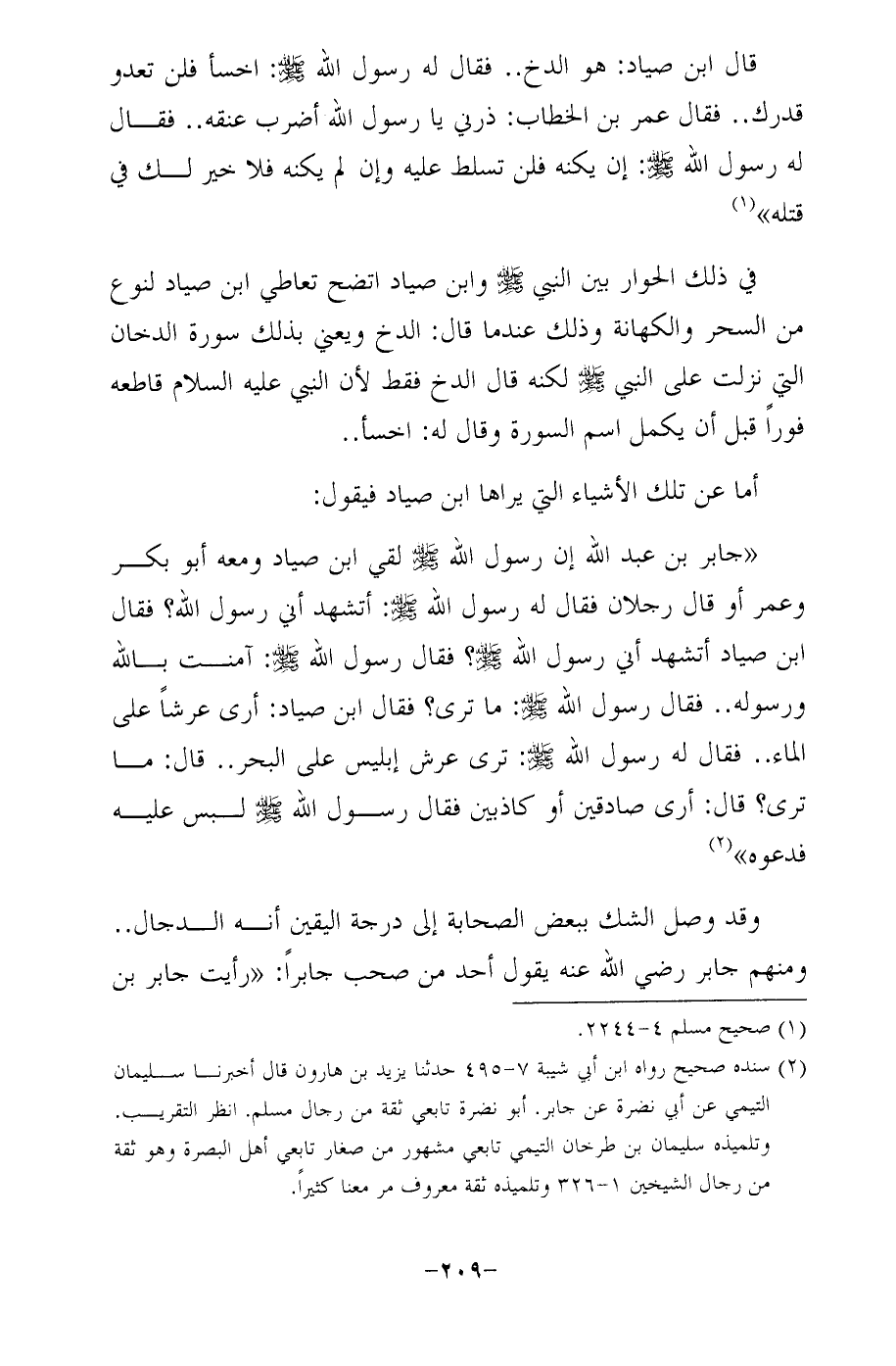 "جابر بن عبد الله إن رسول الله - صلى الله عليه وسلم - لقي ابن صياد ومعه أبو بكر وعمر أو قال رجلان فقال له رسول الله - صلى الله عليه وسلم -: أتشهد أني رسول الله؟ فقال ابن صياد أتشهد أني رسول الله - صلى الله عليه وسلم -؟ فقال رسول الله - صلى الله عليه وسلم -: آمنت بالله ورسوله .. فقال رسول الله - صلى الله عليه وسلم -: ما ترى؟ فقال ابن صياد: أرى عرشًا على الماء .. فقال له رسول الله - صلى الله عليه وسلم -: ترى عرش إبليس على البحر .. قال: ما ترى؟ قال: أرى صادقين أو كاذبين فقال رسول الله - صلى الله عليه وسلم - لبس عليه فدعوه" (¬2)