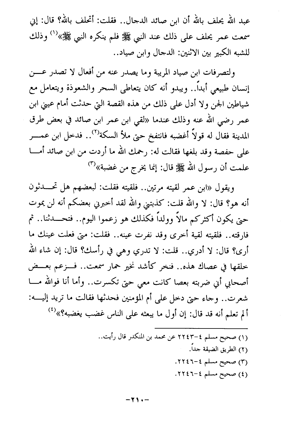 ويقول "ابن عمر لقيته مرتين .. فلقيته فقلت: لبعضهم هل تحدثون أنه هو؟ قال: لا والله قلت: كذبتني والله لقد أخبرني بعضكم أنه لن يموت حتى يكون أكثركم مالًا وولدًا فكذلك هو زعموا اليوم .. فتحدثنا .. ثم فارقته .. فلقيته لقية أخرى وقد نفرت عينه .. فقلت: متى فعلت عينك ما أرى؟ قال: لا أدري .. قلت: لا تدري وهي في رأسك؟ قال: إن شاء الله خلقها في عصاك هذه .. فنخر كأشد نخير حمار سمعت .. فزعم بعض أصحابي أني ضربته بعصا كانت معي حتى تكسرت .. وأما أنا فوالله ما شعرت .. وجاء حتى دخل على أم المؤمنين فحدثها فقالت ما تريد إليه: ألم تعلم أنه قد قال: إن أول ما يبعثه على الناس غضب يغضبه؟ " (¬4)