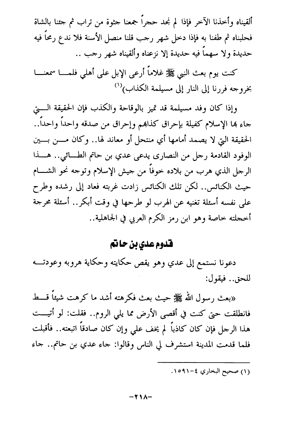 وإذا كان وفد مسيلمة قد تميز بالوقاحة والكذب فإن الحقيقة التي جاء بها الإِسلام كفيلة بإحراق كذابهم وإحراق من صدقه واحدًا واحدًا .. الحقيقة التي لا يصمد أمامها أي منتحل أو معاند لها .. وكان من بين الوفود القادمة رجل من النصارى يدعى عدي بن حاتم الطائي .. هذا الرجل الذي هرب من بلاده خوفًا من جيش الإِسلام وتوجه نحو الشام حيث الكنائس .. لكن تلك الكنائس زادت غربته فعاد إلى رشده وطرح على نفسه أسئلة تغنيه عن الهرب لو طرحها في وقت أبكر .. أسئلة محرجة أخجلته خاصة وهو ابن رمز الكرم العربي في الجاهلية ..