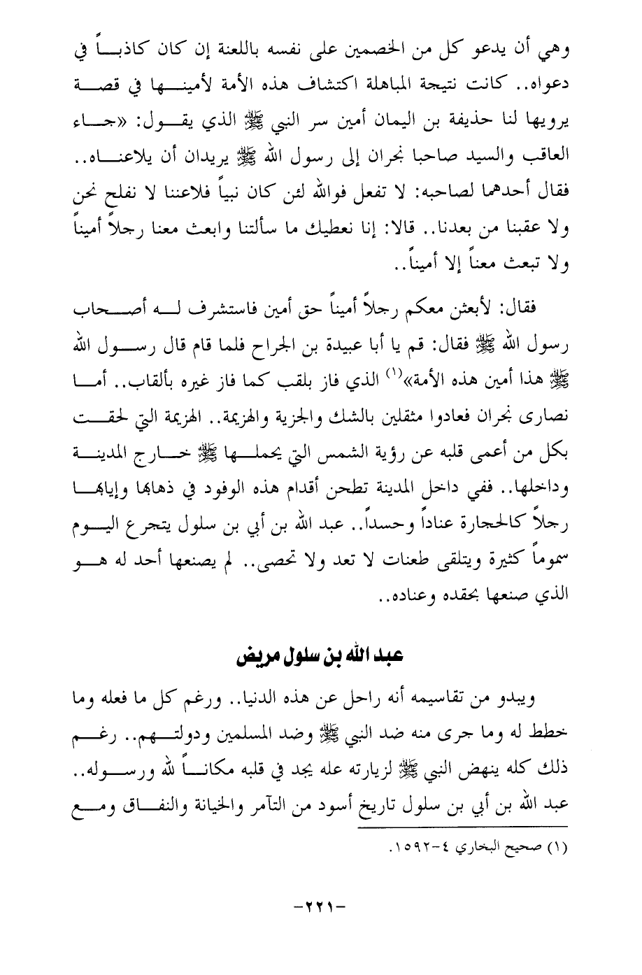 فقال: لأبعثن معكم رجلًا أمينًا حق أمين فاستشرف له أصحاب رسول الله - صلى الله عليه وسلم - فقال: قم يا أبا عبيدة بن الجراح فلما قام قال رسول الله - صلى الله عليه وسلم - هذا أمين هذه الأمة" (¬1) الذي فاز بلقب كما فاز غيره بألقاب .. أما نصارى نجران فعادوا مثقلين بالشك والجزية والهزيمة .. الهزيمة التي لحقت بكل من أعمى قلبه عن رؤية الشمس التي يحملها - صلى الله عليه وسلم - خارج المدينة وداخلها .. ففي داخل المدينة تطحن أقدام هذه الوفود في ذهابها وإيابها رجلًا كالحجارة عنادًا وحسدًا. عبد الله بن أبي بن سلول يتجرع اليوم سمومًا كثيرة ويتلقى طعنات لا تعد ولا تحصى .. لم يصنعها أحد له هو الذي صنعها بحقده وعناده ..