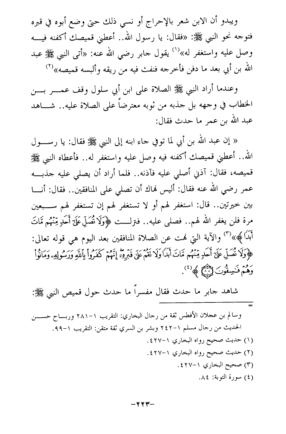 "إن عبد الله بن أبي لما توفي جاء ابنه إلى النبي - صلى الله عليه وسلم - فقال: يا رسول الله .. أعطني قميصك أكفنه فيه وصل عليه وأستغفر له .. فأعطاه النبي - صلى الله عليه وسلم - قميصه، فقال: آذني أصلي عليه فآذنه .. فلما أراد أن يصلي عليه جذبه عمر رضي الله عنه فقال: أليس نهاك أن تصلي على المنافقين .. فقال: أنا بين خيرتين .. قال: استغفر لهم أو لا تستغفر لهم إن تستغفر لهم سبعين مرة فلن يغفر الله لهم .. فصلى عليه .. فنزلت {وَلَا تُصَلِّ عَلَى أَحَدٍ مِنْهُمْ مَاتَ أَبَدًا} (¬3) والآية التي نهت عن الصلاة على المنافقين بعد اليوم هي قوله تعالى: {وَلَا تُصَلِّ عَلَى أَحَدٍ مِنْهُمْ مَاتَ أَبَدًا وَلَا تَقُمْ عَلَى قَبْرِهِ إِنَّهُمْ كَفَرُوا بِاللَّهِ وَرَسُولِهِ وَمَاتُوا وَهُمْ فَاسِقُونَ (84)} (¬4).