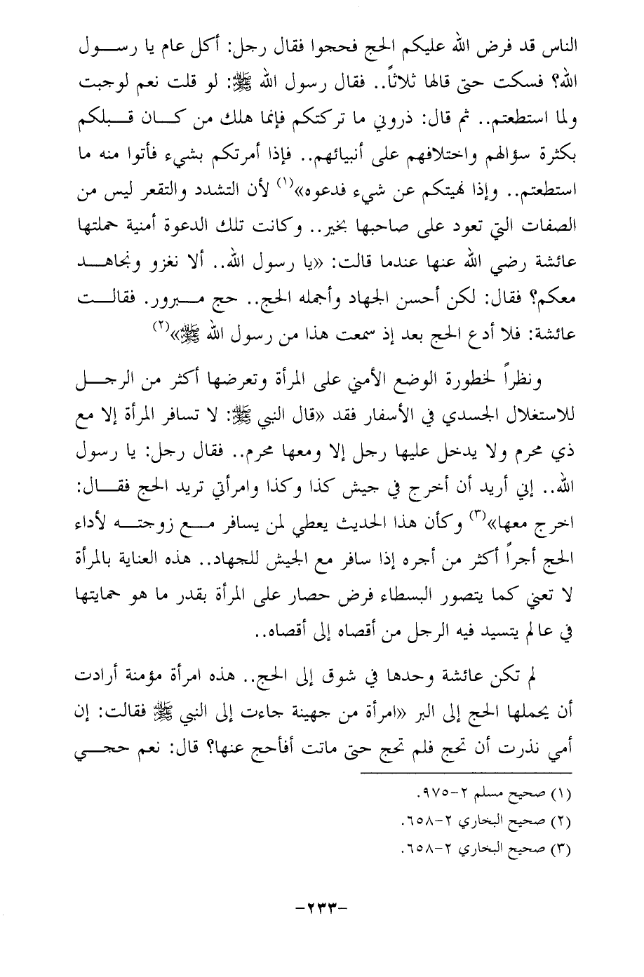 ونظرًا لخطورة الوضع الأمني على المرأة وتعرضها أكثر من الرجل للاستغلال الجسدي في الأسفار فقد "قال النبي - صلى الله عليه وسلم -: لا تسافر المرأة إلا مع ذي محرم ولا يدخل عليها رجل إلا ومعها محرم .. فقال رجل: يا رسول الله .. إني أريد أن أخرج في جيش كذا وكذا وامرأتي تريد الحج فقال: اخرج معها" (¬3) وكأن هذا الحديث يعطي لمن يسافر مع زوجته لأداء الحج أجرًا أكثر من أجره إذا سافر مع الجيش للجهاد .. هذه العناية بالمرأة لا تعني كما يتصور البسطاء فرض حصار على المرأه بقدر ما هو حمايتها في عالم يتسيد فيه الرجل من أقصاه إلى أقصاه ..