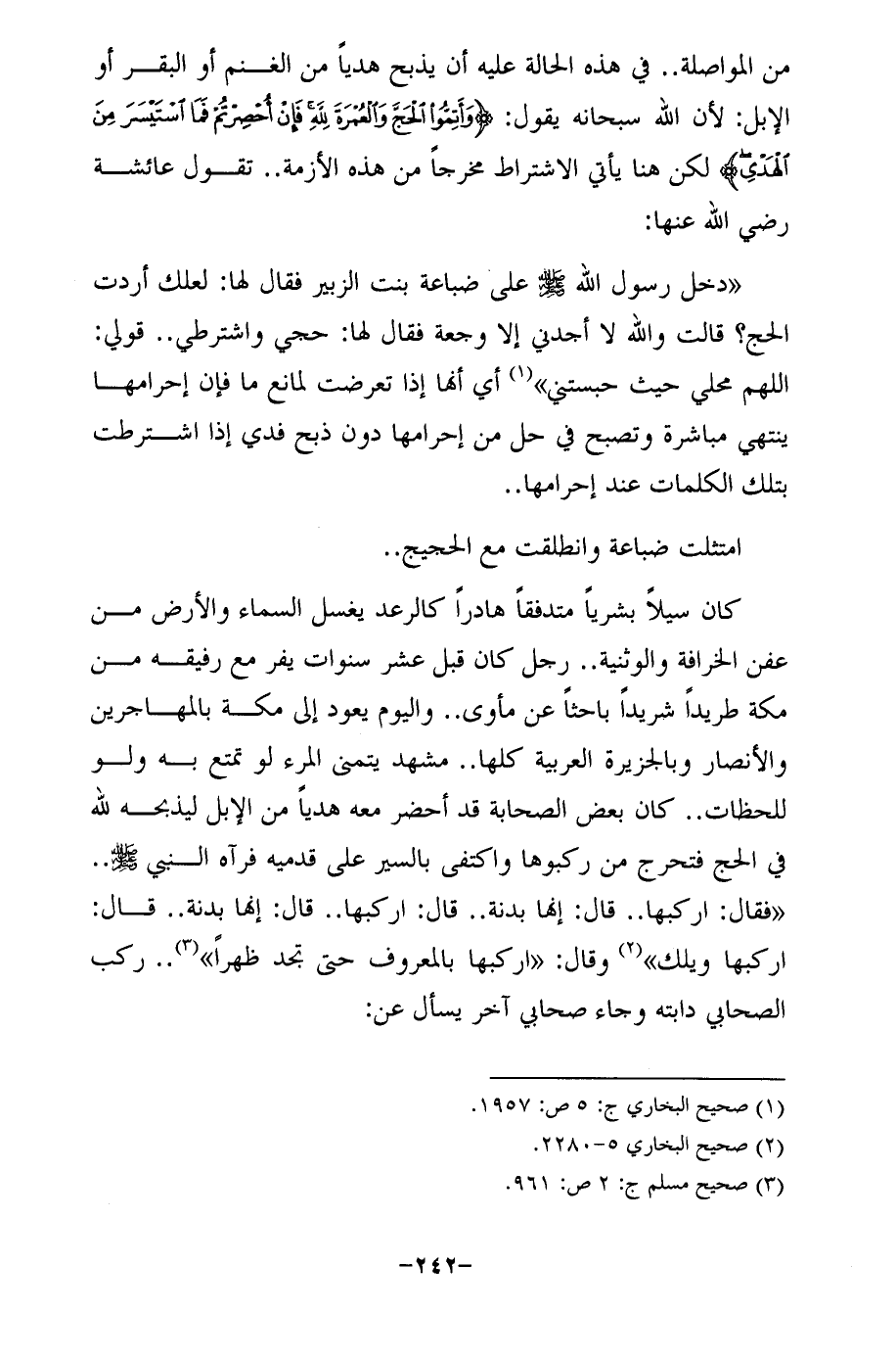 "دخل رسول الله - صلى الله عليه وسلم - على ضباعة بنت الزبير فقال لها: لعلك أردت الحج؟ قالت والله لا أجدني إلا وجعة فقال لها: حجي واشترطي .. قولي: اللَّهم محلي حيث حبستني" (¬1) أي أنها إذا تعرضت لمانع ما فإن إحرامها ينتهي مباشرة وتصبح في حل من إحرامها دون ذبح فدي إذا اشترطت بتلك الكلمات عند إحرامها ..