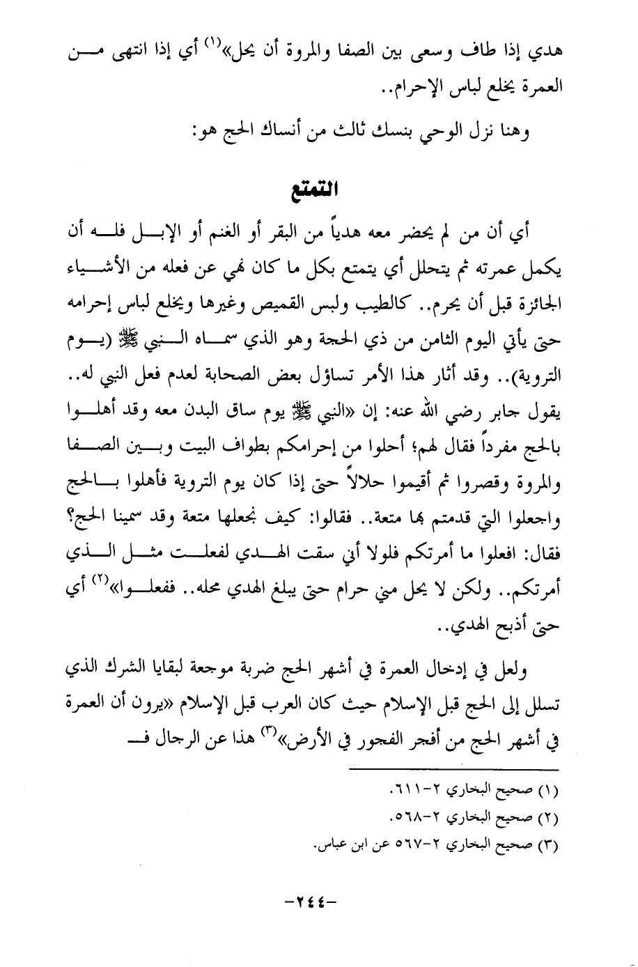 أي أن من لم يحضر معه هديًا من البقر أو الغنم أو الإبل فله أن يكمل عمرته ثم يتحلل أي يتمتع بكل ما كان نهي عن فعله من الأشياء الجائزة قبل أن يحرم .. كالطيب ولبس القميص وغيرها ويخلع لباس إحرامه حتى يأتي اليوم الثامن من ذي الحجة وهو الذي سماه النبي - صلى الله عليه وسلم - (يوم التروية) .. وقد أثار هذا الأمر تساؤل بعض الصحابة لعدم فعل النبي له .. يقول جابر رضي الله عنه: إن "النبي - صلى الله عليه وسلم - يوم ساق البدن معه وقد أهلوا بالحج مفردًا فقال لهم؛ أحلوا من إحرامكم بطواف البيت وبين الصفا والمروة وقصروا ثم أقيموا حلالًا حتى إذا كان يوم التروية فأهلوا بالحج واجعلوا التي قدمتم بها متعة .. فقالوا: كيف نجعلها متعة وقد سمينا الحج؟ فقال: افعلوا ما أمرتكم فلولا أني سقت الهدي لفعلت مثل الذي أمرتكم .. ولكن لا يحل مني حرام حتى يبلغ الهدي محله .. ففعلوا" (¬2) أي حتى أذبح الهدي ..