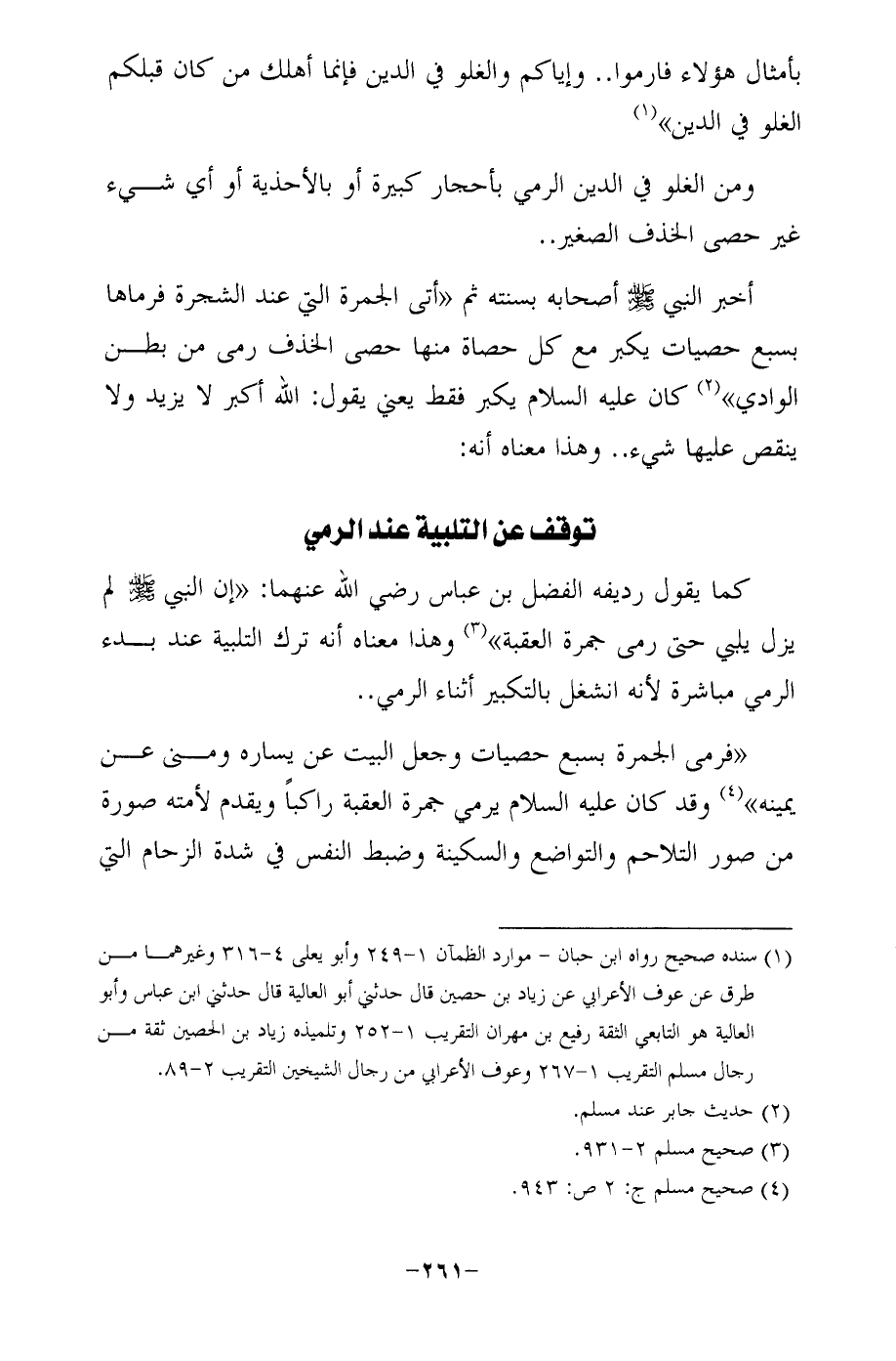 كما يقول رديفه الفضل بن عباس رضي الله عنهما: "إن النبي - صلى الله عليه وسلم - لم يزل يلبي حتى رمى جمرة العقبة" (¬3) وهذا معناه أنه ترك التلبية عند بدء الرمي مباشرة لأنه انشغل بالتكبير أثناء الرمي ..