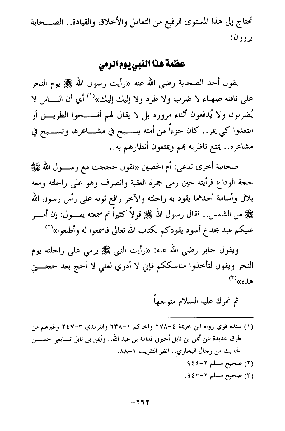 يقول أحد الصحابة رضي الله عنه "رأيت رسول الله - صلى الله عليه وسلم - يوم النحر على ناقته صهباء لا ضرب ولا طرد ولا إليك إليك" (¬1) أي أن الناس لا يُضربون ولا يُدفعون أثناء مروره بل لا يقال لهم أفسحوا الطريق أو ابتعدوا كي يمر .. كان جزءًا من أمته يسبح في مشاعرها وتسبح في مشاعره .. يمتع ناظريه بهم ويمتعون أنظارهم به ..