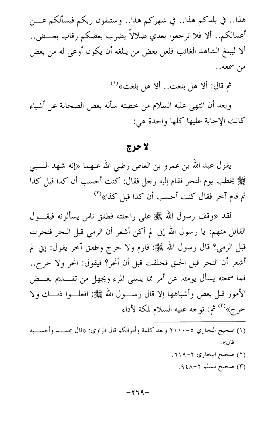 هذا .. في بلدكم هذا .. في شهركم هذا .. وستلقون ربكم فيسألكم عن أعمالكم .. ألا فلا ترجعوا بعدي ضلالًا يضرب بعضكم رقاب بعض .. ألا ليبلغ الشاهد الغائب فلعل بعض من يبلغه أن يكون أوعى له من بعض من سمعه ..
