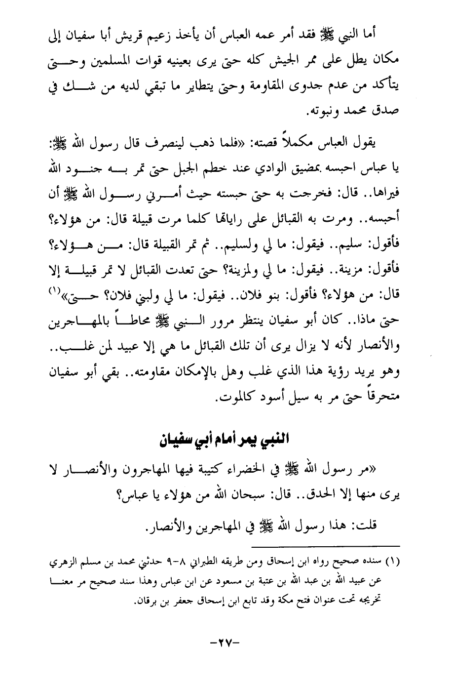 أما النبي - صلى الله عليه وسلم - فقد أمر عمه العباس أن يأخذ زعيم قريش أبا سفيان إلى مكان يطل على ممر الجيش كله حتى يرى بعينيه قوات المسلمين وحتى يتأكد من عدم جدوى المقاومة وحتى يتطاير ما تبقى لديه من شك في صدق محمَّد ونبوته.