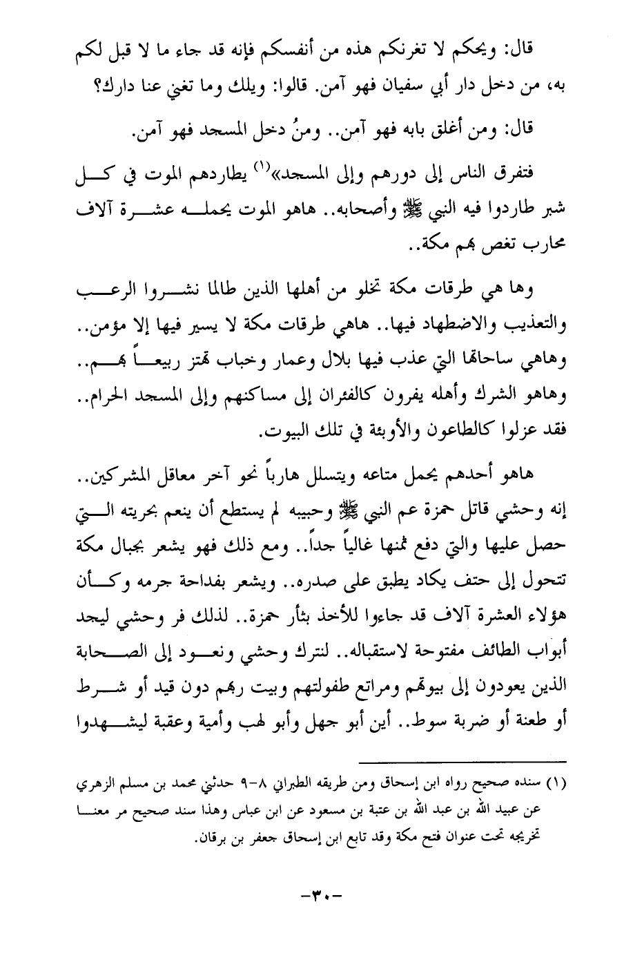 (¬1) سنده صحيح رواه ابن إسحاق ومن طريقه الطبراني 8 - 9 حدثني محمَّد بن مسلم الزهري عن عبيد الله بن عبد الله بن عتبة بن مسعود عن ابن عباس وهذا سند صحيح مر معنا تخريجه تحت عنوان فتح مكة وقد تابع ابن إسحاق جعفر بن برقان.