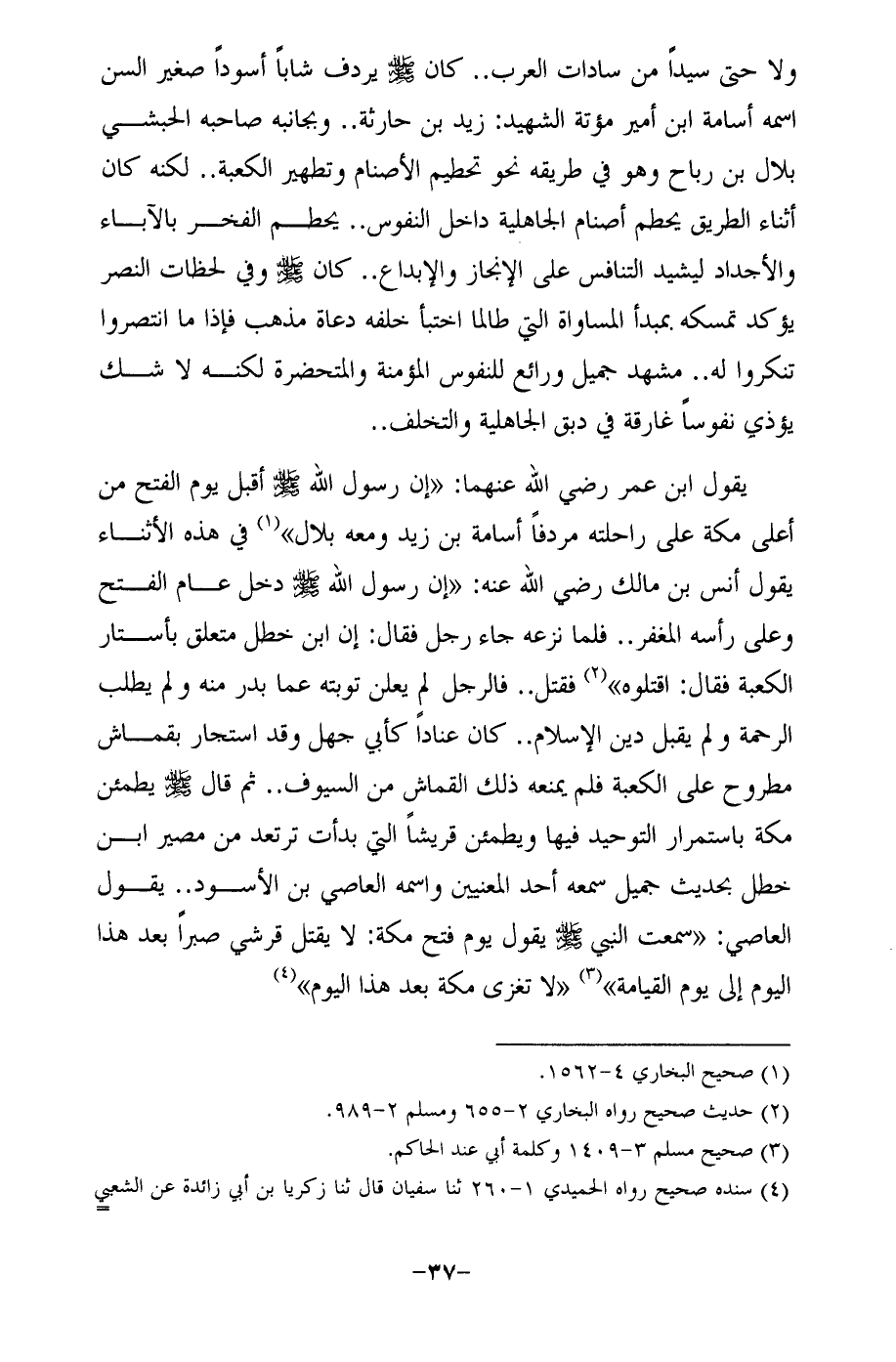 ولا حتى سيدًا من سادات العرب .. كان - صلى الله عليه وسلم - يردف شابًا أسودًا صغير السن اسمه أسامة ابن أمير مؤتة الشهيد: زيد بن حارثة .. وبجانبه صاحبه الحبشي بلال بن رباح وهو في طريقه نحو تحطيم الأصنام وتطهير الكعبة .. لكنه كان أثناء الطريق يحطم أصنام الجاهلية داخل النفوس .. يحطم الفخر بالآباء والأجداد ليشيد التنافس على الإنجاز والإبداع .. كان - صلى الله عليه وسلم - وفي لحظات النصر يؤكد تمسكه بمبدأ المساواة التي طالما اختبأ خلفه دعاة مذهب فإذا ما انتصروا تنكروا له .. مشهد جميل ورائع للنفوس المؤمنة والمتحضرة لكنه لا شك يؤذي نفوسًا غارقة في دبق الجاهلية والتخلف ..