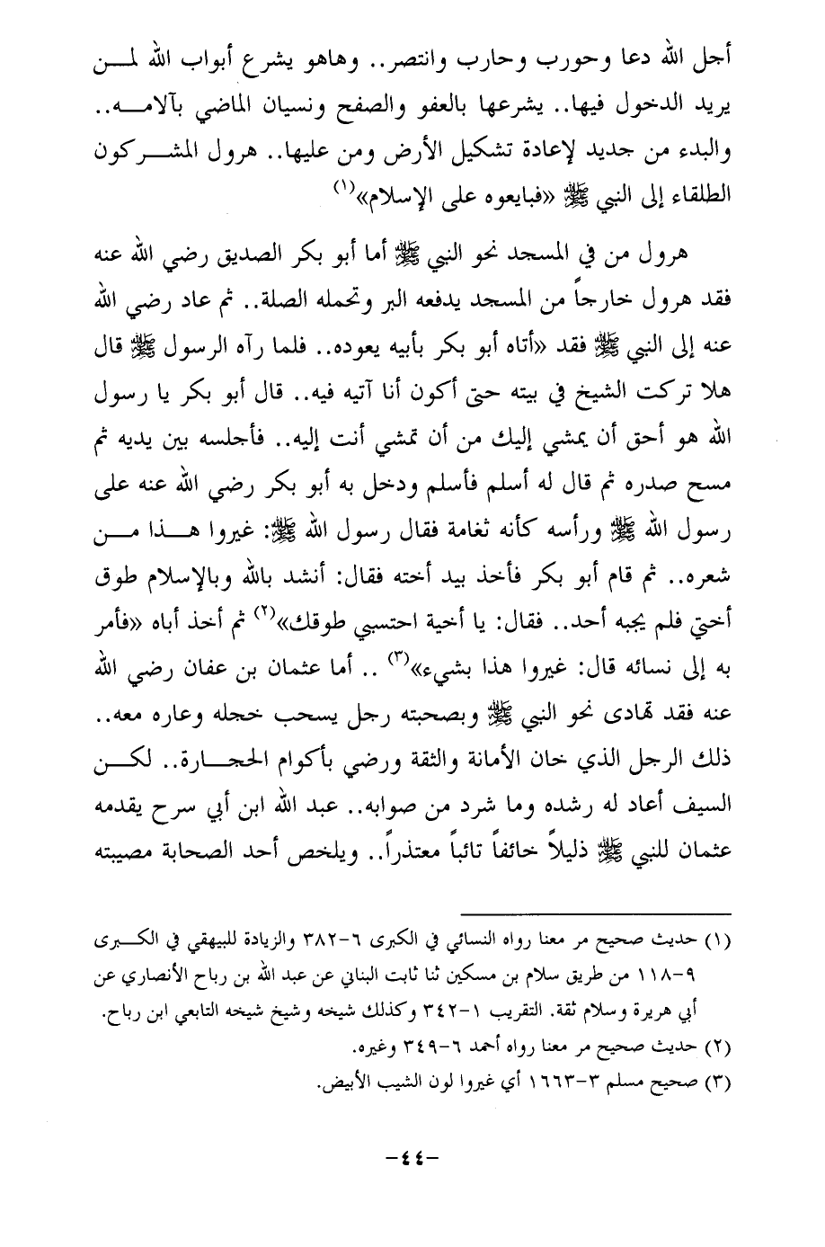 هرول من في المسجد نحو النبي - صلى الله عليه وسلم - أما أبو بكر الصديق - رضي الله عنه - فقد هرول خارجًا من المسجد يدفعه البر وتحمله الصلة .. ثم عاد - رضي الله عنه - إلى النبي - صلى الله عليه وسلم - فقد "أتاه أبو بكر بأبيه يعوده .. فلما رآه الرسول - صلى الله عليه وسلم - قال هلا تركت الشيخ في بيته حتى أكون أنا آتيه فيه .. قال أبو بكر يا رسول الله هو أحق أن يمشي إليك من أن تمشي أنت إليه .. فأجلسه بين يديه ثم مسح صدره ثم قال له أسلم فأسلم ودخل به أبو بكر - رضي الله عنه - على رسول الله - صلى الله عليه وسلم - ورأسه كأنه ثغامة فقال رسول الله - صلى الله عليه وسلم -: غيروا هذا من شعره .. ثم قام أبو بكر فأخذ بيد أخته فقال: أنشد بالله وبالإسلام طوق أختي فلم يجبه أحد .. فقال: يا أخية احتسبي طوقك" (¬2) ثم أخذ أباه "فأمر به إلى نسائه قال: غيروا هذا بشيء" (¬3) .. أما عثمان بن عفان - رضي الله عنه - فقد تهادى نحو النبي - صلى الله عليه وسلم - وبصحبته رجل يسحب خجله وعاره معه .. ذلك الرجل الذي خان الأمانة والثقة ورضي بأكوام الحجارة .. لكن السيف أعاد له رشده وما شرد من صوابه .. عبد الله ابن أبي سرح يقدمه عثمان للنبي - صلى الله عليه وسلم - ذليلًا خائفًا تائبًا معتذرًا .. ويلخص أحد الصحابة مصيبته