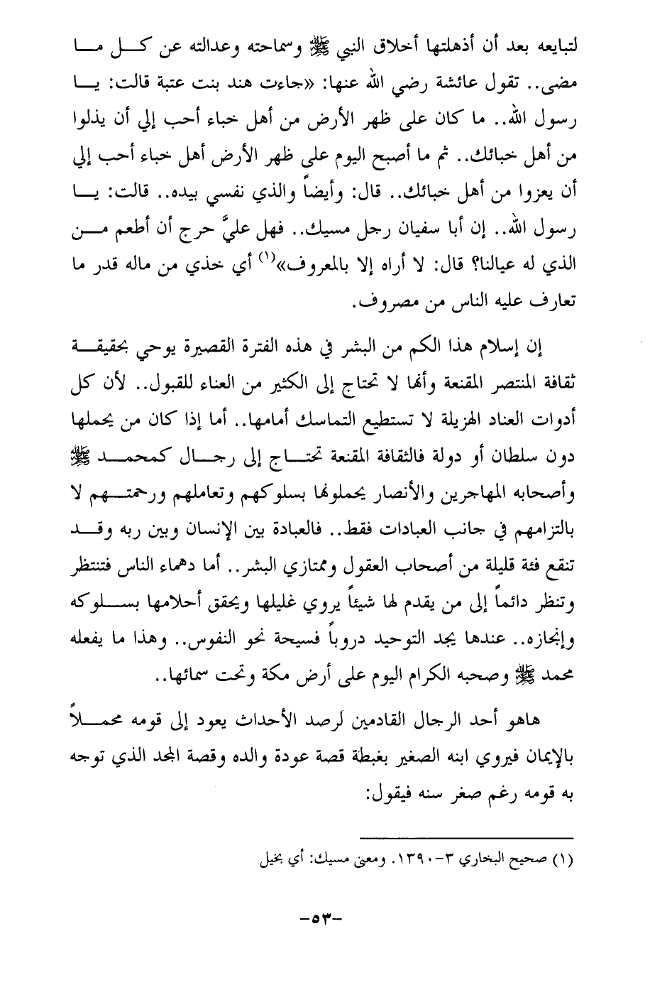 إن إسلام هذا الكم من البشر في هذه الفترة القصيرة يوحي بحقيقة ثقافة المنتصر المقنعة وأنها لا تحتاج إلى الكثير من العناء للقبول .. لأن كل أدوات العناد الهزيلة لا تستطيع التماسك أمامها .. أما إذا كان من يحملها دون سلطان أو دولة فالثقافة المقنعة تحتاج إلى رجال كمحمد - صلى الله عليه وسلم - وأصحابه المهاجرين والأنصار يحملونها بسلوكهم وتعاملهم ورحمتهم لا بالتزامهم في جانب العبادات فقط .. فالعبادة بين الإنسان وبين ربه وقد تنقع فئة قليلة من أصحاب العقول وممتازي البشر .. أما دهماء الناس فتنتظر وتنظر دائمًا إلى من يقدم لها شيئًا يروي غليلها ويحقق أحلامها بسلوكه وإنجازه .. عندها يجد التوحيد دروبًا فسيحة نحو النفوس .. وهذا ما يفعله محمَّد - صلى الله عليه وسلم - وصحبه الكرام اليوم على أرض مكة وتحت سمائها ..