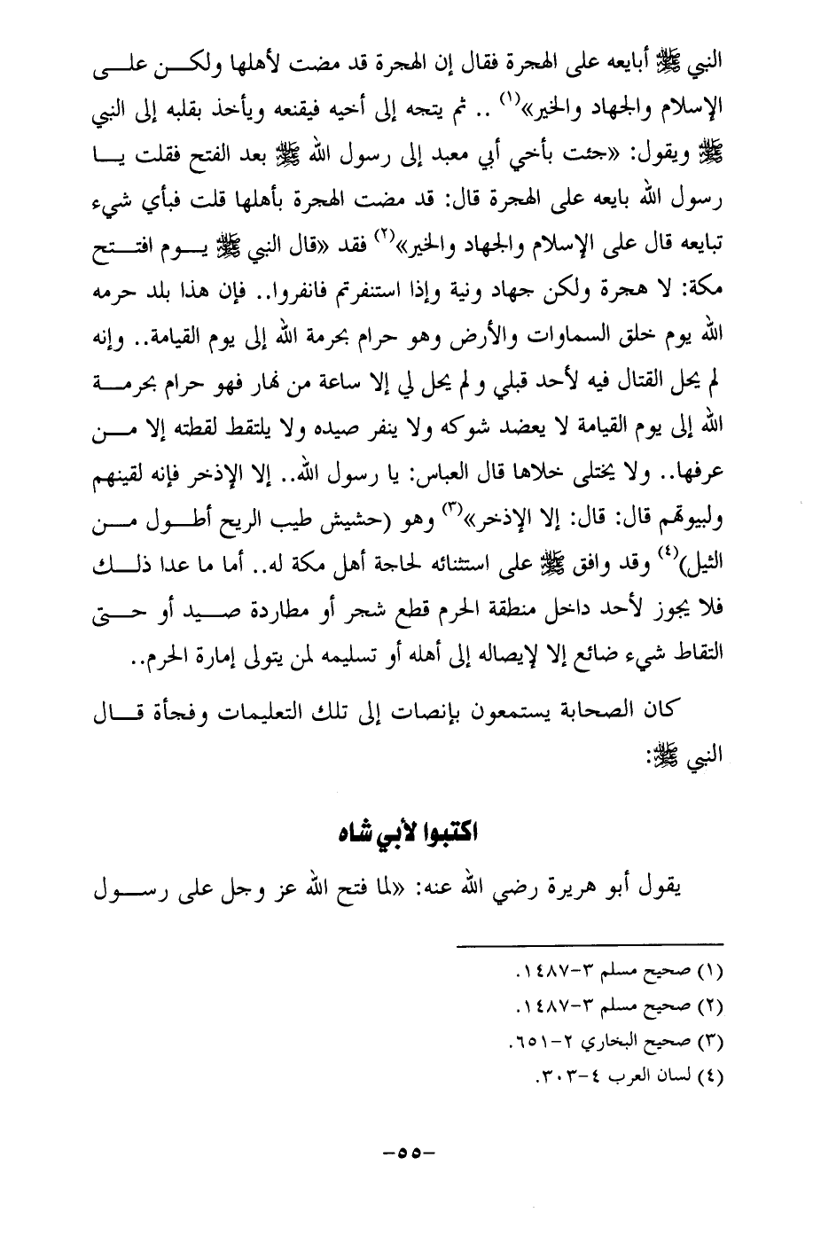 النبي - صلى الله عليه وسلم - أبايعه على الهجرة فقال إن الهجرة قد مضت لأهلها ولكن على الإِسلام والجهاد والخير" (¬1) .. ثم يتجه إلى أخيه فيقنعه ويأخذ بقلبه إلى النبي - صلى الله عليه وسلم - ويقول: "جئت بأخي أبي معبد إلى رسول الله - صلى الله عليه وسلم - بعد الفتح فقلت يا رسول الله بايعه على الهجرة قال: قد مضت الهجرة بأهلها قلت فبأي شيء تبايعه قال على الإِسلام والجهاد والخير" (¬2) فقد "قال النبي - صلى الله عليه وسلم - يوم افتتح مكة: لا هجرة ولكن جهاد ونية وإذا استنفرتم فانفروا .. فإن هذا بلد حرمه الله يوم خلق السماوات والأرض وهو حرام بحرمة الله إلى يوم القيامة .. وإنه لم يحل القتال فيه لأحد قبلي ولم يحل لي إلا ساعة من نهار فهو حرام بحرمة الله إلى يوم القيامة لا يعضد شوكه ولا ينفر صيده ولا يلتقط لقطه إلا من عرفها .. ولا يختلى خلاها قال العباس: يا رسول الله .. إلا الإذخر فإنه لقينهم ولبيوتهم قال: قال: إلا الإذخر" (¬3) وهو (حشيش طيب الريح أطول من الثيل) (¬4) وقد وافق - صلى الله عليه وسلم - على استثنائه لحاجة أهل مكة له .. أما ما عدا ذلك فلا يجوز لأحد داخل منطقة الحرم قطع شجر أو مطاردة صيد أو حتى التقاط شيء ضائع إلا لإيصاله إلى أهله أو تسليمه لمن يتولى إمارة الحرم ..