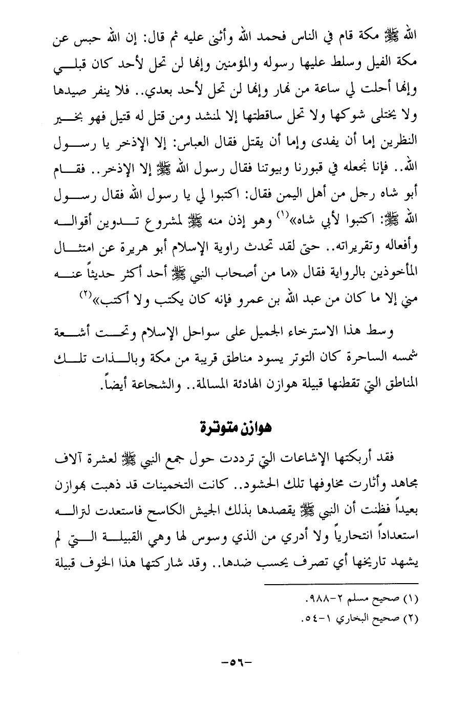 الله - صلى الله عليه وسلم - مكة قام في الناس فحمد الله وأثني عليه ثم قال: إن الله حبس عن مكة الفيل وسلط عليها رسوله والمؤمنين وإنها لن تحل لأحد كان قبلي وإنها أحلت لي ساعة من نهار وإنها لن تحل لأحد بعدي .. فلا ينفر صيدها ولا يختلى شوكها ولا تحل ساقطتها إلا لمنشد ومن قتل له قتيل فهو بخير النظرين إما أن يفدى وإما أن يقتل فقال العباس: إلا الإذخر يا رسول الله .. فإنا نجعله في قبورنا وبيوتنا فقال رسول الله - صلى الله عليه وسلم - إلا الإذخر .. فقام أبو شاه رجل من أهل اليمن فقال: اكتبوا لي يا رسول الله فقال رسول الله - صلى الله عليه وسلم -: اكتبوا لأبي شاه" (¬1) وهو إذن منه - صلى الله عليه وسلم - لمشروع تدوين أقواله وأفعاله وتقريراته .. حتى لقد تحدث راوية الإِسلام أبو هريرة عن امتثال المأخوذين بالرواية فقال "ما من أصحاب النبي - صلى الله عليه وسلم - أحد أكثر حديثًا عنه مني إلا ما كان من عبد الله بن عمرو فإنه كان يكتب ولا أكتب" (¬2)