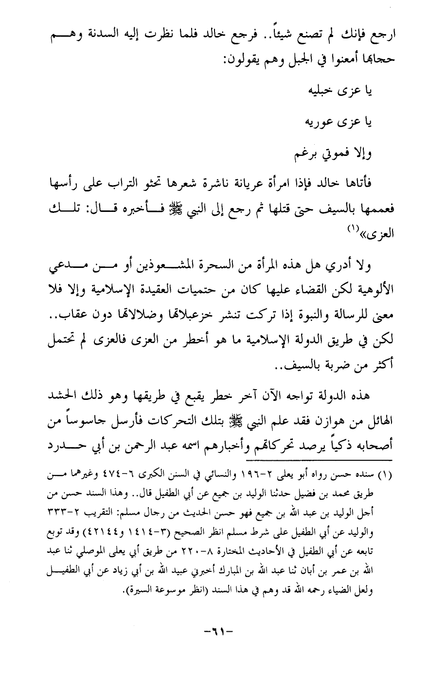 ولا أدري هل هذه المرأة من السحرة المشعوذين أو من مدعي الألوهية لكن القضاء عليها كان من حتميات العقيدة الإِسلامية وإلا فلا معنى للرسالة والنبوة إذا تركت تنشر خزعبلاتها وضلالاتها دون عقاب .. لكن في طريق الدولة الإِسلامية ما هو أخطر من العزى فالعزى لم تحتمل أكثر من ضربة بالسيف ..