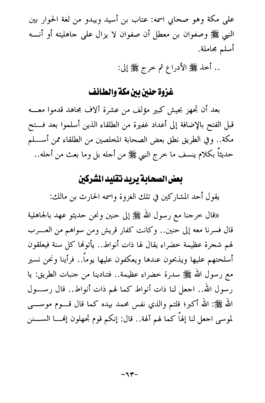 "قال خرجنا مع رسول الله - صلى الله عليه وسلم - إلى حنين ونحن حديثو عهد بالجاهلية قال فسرنا معه إلى حنين .. وكانت كفار قريش ومن سواهم من العرب لهم شجرة عظيمة خضراء يقال لها ذات أنواط .. يأتونها كل سنة فيعلقون أسلحتهم عليها ويذبحون عندها ويعكفون عليها يومًا .. فرأينا ونحن نسير مع رسول الله - صلى الله عليه وسلم - سدرة خضراء عظيمة .. فتنادينا من جنبات الطريق: يا رسول الله .. اجعل لنا ذات أنواط كما لهم ذات أنواط .. قال رسول الله - صلى الله عليه وسلم -: الله أكبر؛ قلتم والذي نفس محمَّد بيده كما قال قوم موسى لموسى اجعل لنا إلهًا كما لهم آلهة .. قال: إنكم قوم تجهلون إنها السنن