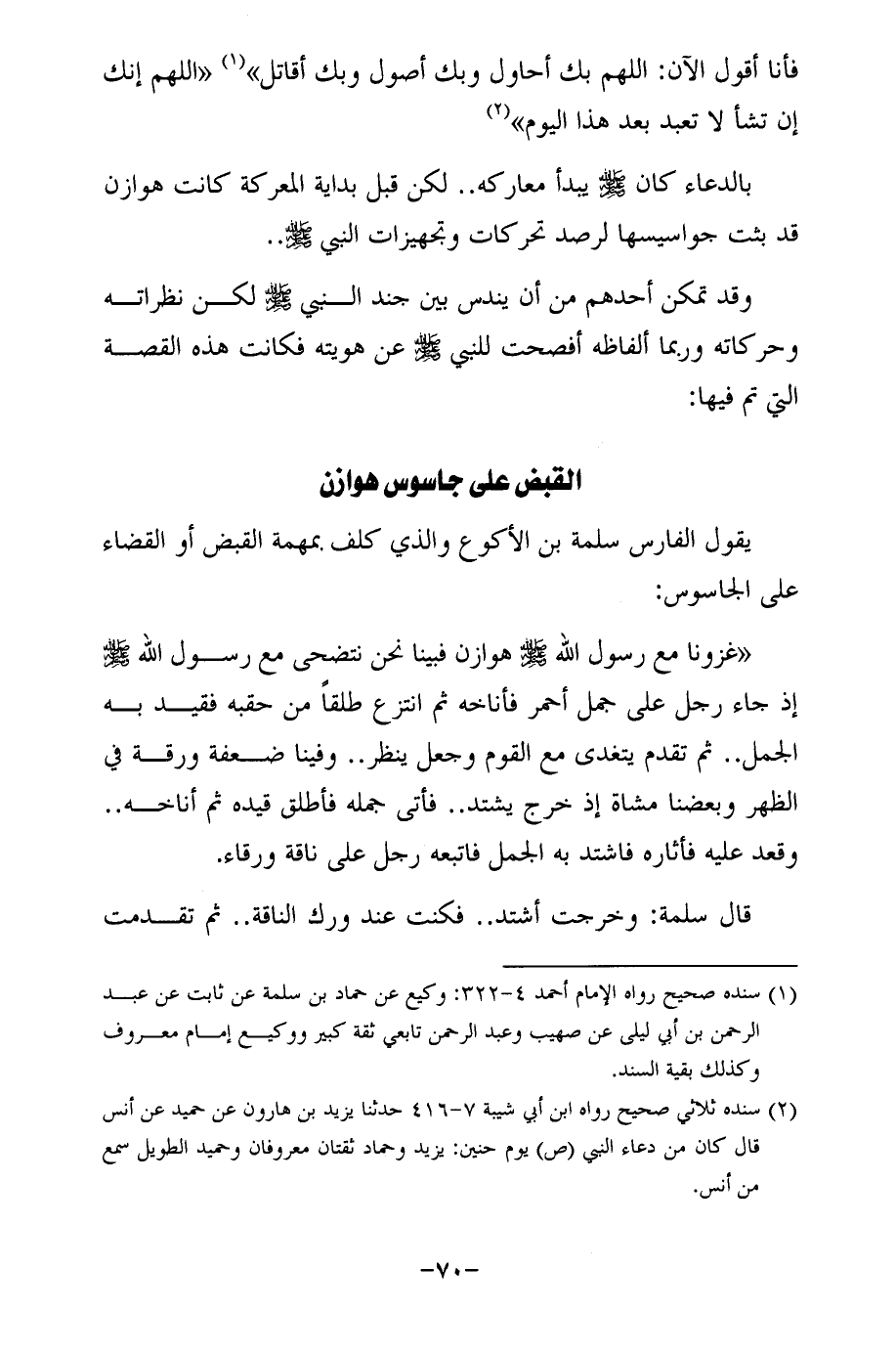 "غزونا مع رسول الله - صلى الله عليه وسلم - هوازن فبينا نحن نتضحى مع رسول الله - صلى الله عليه وسلم - إذ جاء رجل على جمل أحمر فأناخه ثم انتزع طلقًا من حقبه فقيد به الجمل .. ثم تقدم يتغدى مع القوم وجعل ينظر .. وفينا ضعفة ورقة في الظهر وبعضنا مشاة إذ خرج يشتد .. فأتى جمله فأطلق قيده ثم أناخه .. وقعد عليه فأثاره فاشتد به الجمل فاتبعه رجل على ناقة ورقاء.