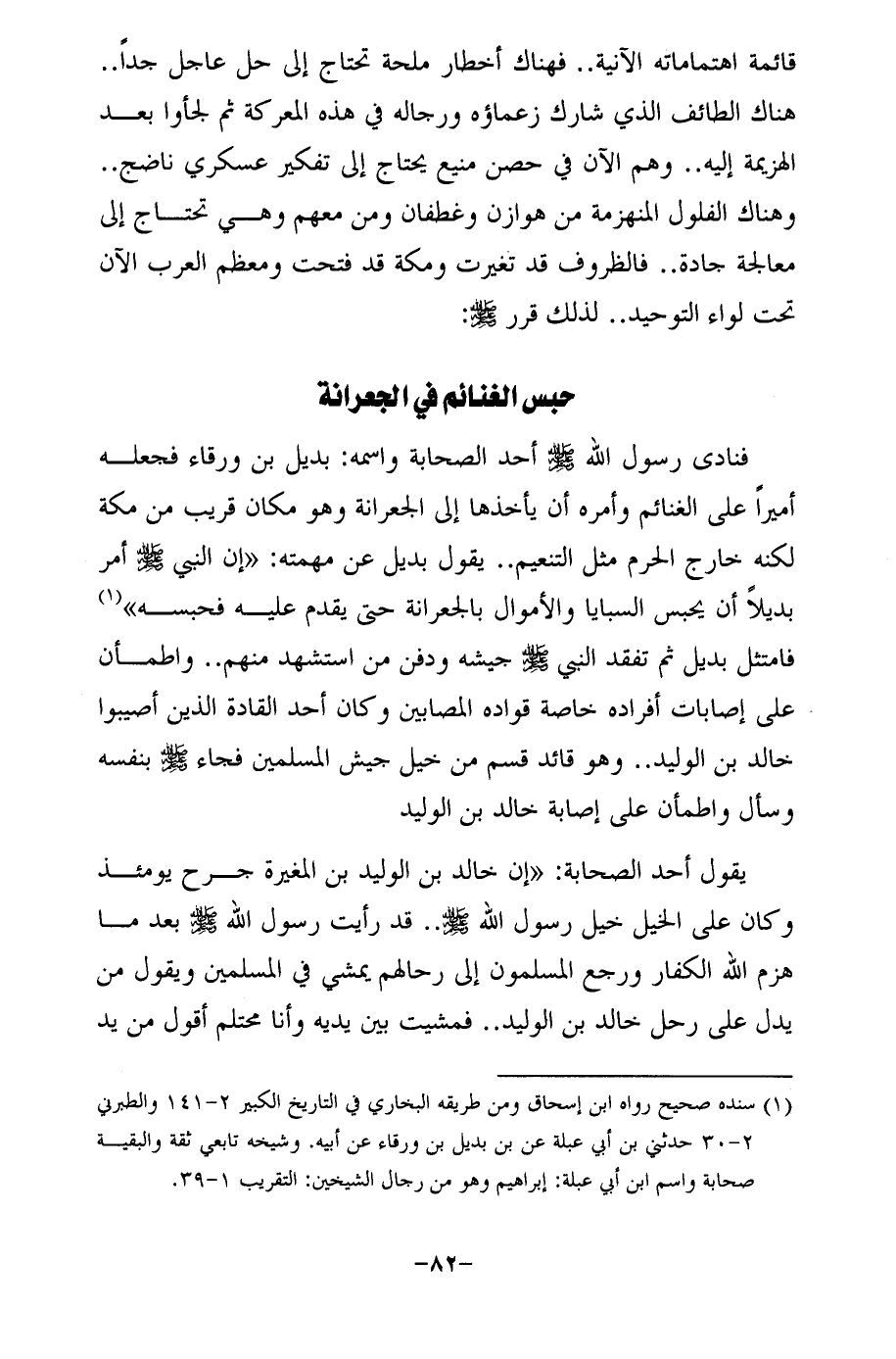 فنادى رسول الله - صلى الله عليه وسلم - أحد الصحابة واسمه: بديل بن ورقاء فجعله أميرًا على الغنائم وأمره أن يأخذها إلى الجعرانة وهو مكان قريب من مكة لكنه خارج الحرم مثل التنعيم .. يقول بديل عن مهمته: "إن النبي - صلى الله عليه وسلم - أمر بديلًا أن يحبس السبايا والأموال بالجعرانة حتى يقدم عليه فحبسه" (¬1) فامتثل بديل ثم تفقد النبي - صلى الله عليه وسلم - جيشه ودفن من استشهد منهم .. واطمأن على إصابات أفراده خاصة قواده المصابين وكان أحد القادة الذين أصيبوا خالد بن الوليد .. وهو قائد قسم من خيل جيش المسلمين فجاء - صلى الله عليه وسلم - بنفسه وسأل واطمأن على إصابة خالد بن الوليد
