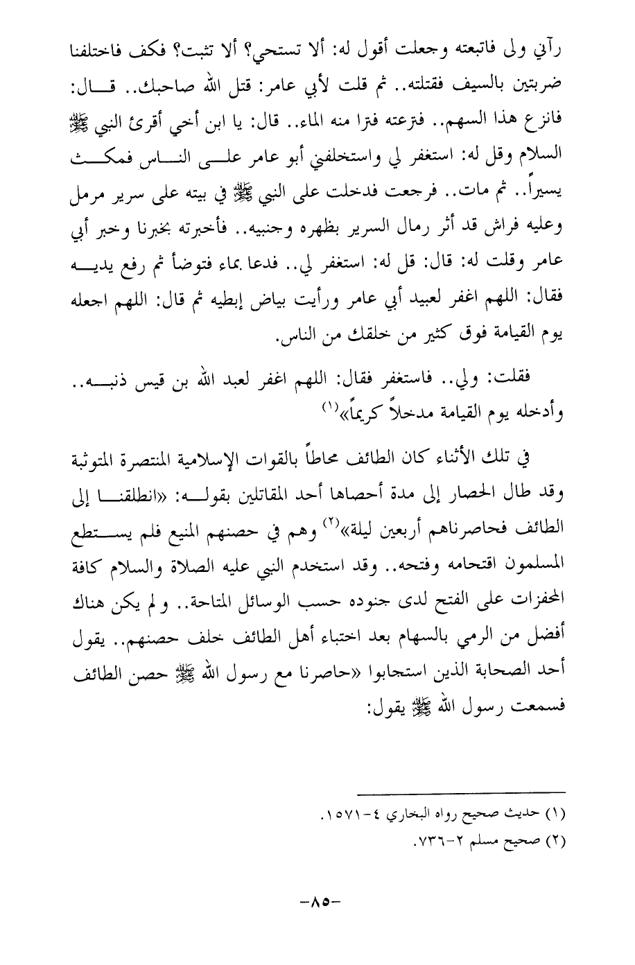 رآني ولى فاتبعته وجعلت أقول له: ألا تستحي؟ ألا تثبت؟ فكف فاختلفنا ضربتين بالسيف فقتلته .. ثم قلت لأبي عامر: قتل الله صاحبك .. قال: فانزع هذا السهم .. فزعته فنزا منه الماء .. قال: يا ابن أخي أقرئ النبي - صلى الله عليه وسلم - السلام وقل له: استغفر لي واستخلفني أبو عامر على الناس فمكث يسيرًا .. ثم مات .. فرجعت فدخلت على النبي - صلى الله عليه وسلم - في بيته على سرير مرمل وعليه فراش قد أثر رمال السرير بظهره وجنبيه .. فأخبرته بخبرنا وخبر أبي عامر وقلت له: قال: قل له: استغفر لي .. فدعا بماء فتوضأ ثم رفع يديه فقال: اللَّهم اغفر لعبيد أبي عامر ورأيت بياض إبطيه ثم قال: اللَّهم اجعله يوم القيامة فوق كثير من خلقك من الناس.