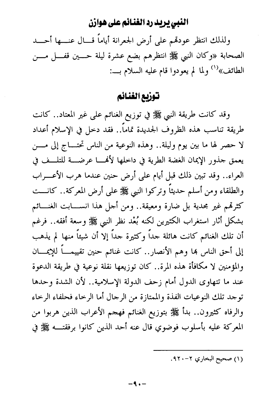 وقد كانت طريقة النبي - صلى الله عليه وسلم - في توزيع الغنائم على غير المعتاد .. كانت طريقة تناسب هذه الظروف الجديدة تمامًا .. فقد دخل في الإِسلام أعداد لا حصر لها ما بين يوم وليلة .. وهذه النوعية من الناس تحتاج إلى من يعمق جذور الإيمان الغضة الطرية في داخلها لأنها عرضة للتلف في العراء .. وقد تبين ذلك قبل أيام على أرض حنين عندما هرب الأعراب والطلقاء ومن أسلم حديثًا وتركوا النبي - صلى الله عليه وسلم - على أرض المعركة .. كانت كثرتهم غير مجدية بل ضارة ومعيقة .. ومن أجل هذا انسابت الغنائم بشكل أثار استغراب الكثيرين لكنه بُعْد نظر النبي - صلى الله عليه وسلم - وسعة أفقه .. فرغم أن تلك الغنائم كانت هائلة جدًا وكثيرة جدًا إلا أن شيئًا منها لم يذهب إلى أحق الناس بها وهم الأنصار .. كانت غنائم حنين تقييمًا للإيمان والمؤمنين لا مكافأة هذه المرة .. كان توزيعها نقلة نوعية في طريقة الدعوة عند ما تتهاوى الدول أمام زحف الدولة الإِسلامية .. لأن الشدة وحدها توجد تلك النوعيات الفذة والممتازة من الرجال أما الرخاء فحلفاء الرخاء والرفاه كثيرون .. بدأ - صلى الله عليه وسلم - بتوزيع الغنائم فهجم الأعراب الذين هربوا من المعركة عليه بأسلوب فوضوي قال عنه أحد الذين كانوا برفقته - صلى الله عليه وسلم - في