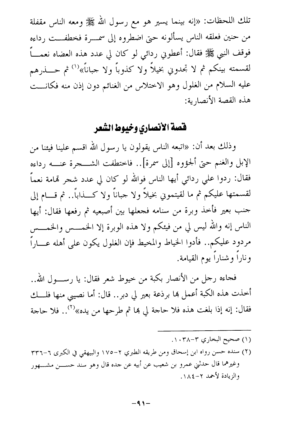 وذلك بعد أن: "اتبعه الناس يقولون يا رسول الله اقسم علينا فيئنا من الإبل والغنم حتى ألجؤوه [إلى سمرة] .. فاختطفت الشجرة عنه رداءه فقال: ردوا علي ردائي أيها الناس فوالله لو كان لي عدد شجر تهامة نعمًا لقسمتها عليكم ثم ما لقيتموني بخيلًا ولا جبانًا ولا كذابًا .. ثم قام إلى جنب بعير فأخذ وبرة من سنامه فجعلها بين أصبعيه ثم رفعها فقال: أيها الناس إنه والله ليس لي من فيئكم ولا هذه الوبرة إلا الخمس والخمس مردود عليكم .. فأدوا الخياط والمخيط فإن الغلول يكون على أهله عارًا ونارًا وشنارًا يوم القيامة.