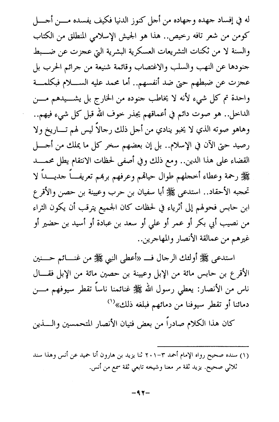 له في إفساد جهده وجهاده من أجل كنوز الدنيا فكيف يفسده من أجل كومن من شعر تافه رخيص .. هذا هو الجيش الإِسلامي المنطلق من الكتاب والسنة لا من ثكنات التشريعات العسكرية البشرية التي عجزت عن ضبط جنودها عن النهب والسلب والاغتصاب وقائمة شنيعة من جرائم الحرب بل عجزت عن ضبطهم حتى ضد أنفسهم .. أما محمَّد عليه السلام فبكلمة واحدة تم كل شيء لأنه لا يخاطب جنوده من الخارج بل يشيدهم من الداخل .. هو صوت دائم في أعماقهم يجذر خوف الله قبل كل شيء فيهم .. وها هو صوته الذي لا يخبو ينادي من أجل ذلك رجالًا ليس لهم تاريخ ولا رصيد حتى الآن في الإِسلام .. بل إن بعضهم سخر كل ما يملك من أجل القضاء على هذا الدين .. ومع ذلك وفي أصفى لحظات الانتقام يطل محمَّد - صلى الله عليه وسلم - رحمة وعطاء أخجلهم طوال حياتهم وعرفهم بربهم تعريفًا جديدًا لا تحجبه الأحقاد .. استدعى - صلى الله عليه وسلم - أبا سفيان بن حرب وعيينة بن حصن والأقرع ابن حابس فحولهم إلى أثرياء في لحظات كان الجميع يترقب أن يكون الثراء من نصيب أبي بكر أو عمر أو علي أو سعد بن عبادة أو أسيد بن حضير أو غيرهم من عمالقة الأنصار والمهاجرين ..
