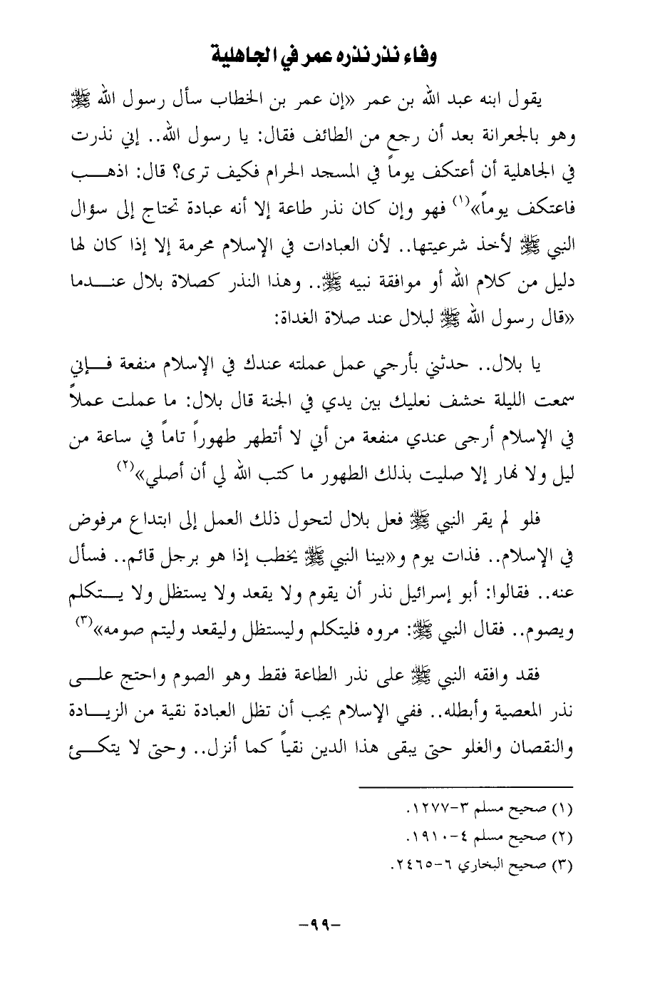 يقول ابنه عبد الله بن عمر "إن عمر بن الخطاب سأل رسول الله - صلى الله عليه وسلم - وهو بالجعرانة بعد أن رجع من الطائف فقال: يا رسول الله .. إني نذرت في الجاهلية أن أعتكف يومًا في المسجد الحرام فكيف ترى؟ قال: اذهب فاعتكف يومًا" (¬1) فهو وإن كان نذر طاعة إلا أنه عبادة تحتاج إلى سؤال النبي - صلى الله عليه وسلم - لأخذ شرعيتها .. لأن العبادات في الإِسلام محرمة إلا إذا كان لها دليل من كلام الله أو موافقة نبيه - صلى الله عليه وسلم - .. وهذا النذر كصلاة بلال عندما "قال رسول الله - صلى الله عليه وسلم - لبلال عند صلاة الغداة:
