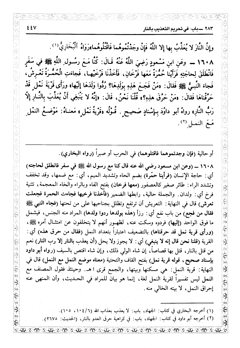 1608- وعن ابن مسعودٍ - رضي الله عنه - قَالَ: كنَّا مَعَ رسول الله - صلى الله عليه وسلم - في سَفَرٍ، فانْطَلَقَ لحَاجَتِهِ، فَرَأيْنَا حُمَّرَةً مَعَهَا فَرْخَانِ، فَأَخَذْنَا فَرْخَيْهَا، فَجَاءتِ الحُمَّرَةُ فَجَعَلَتْ تَعْرِشُ فَجَاءَ النَّبيُّ - صلى الله عليه وسلم - فَقَالَ: "مَنْ فَجَعَ هذِهِ بِوَلَدِهَا؟ ، رُدُّوا وَلَدَهَا إِلَيْها". ورأَى قَرْيَةَ نَمْلٍ قَدْ حَرَّقْنَاهَا، فَقَالَ: "مَنْ حَرَّقَ هذِهِ؟ " قُلْنَا: نَحْنُ قَالَ: "إنَّهُ لا يَنْبَغِي أنْ يُعَذِّبَ بالنَّارِ إِلاَّ رَبُّ النَّارِ". رواه أَبُو داود بإسناد صحيح.