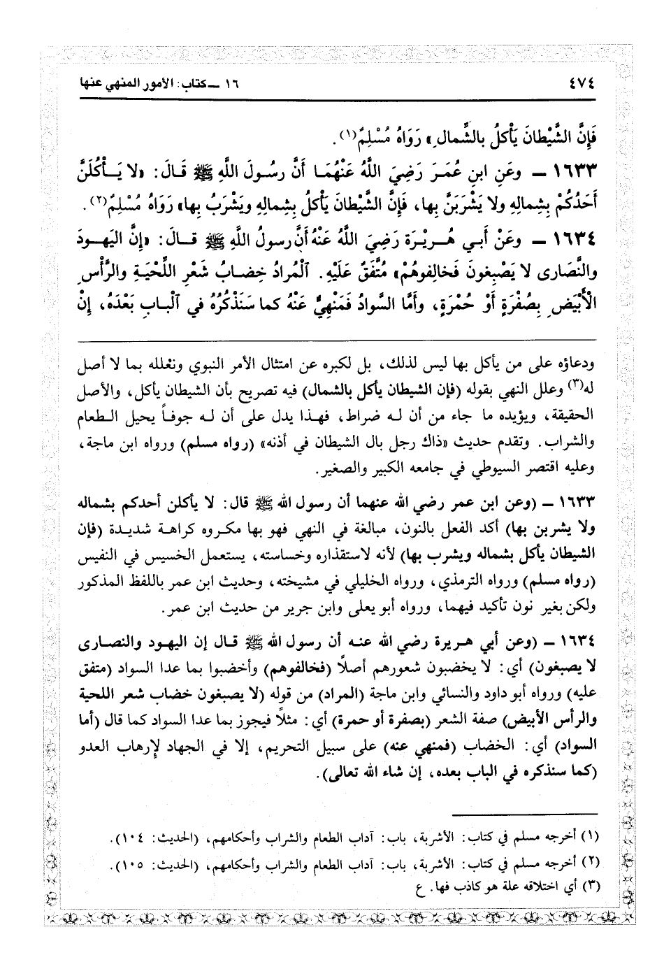 1633- وعن ابن عمر رضي الله عنهما: أنَّ رسُولَ الله - صلى الله عليه وسلم -، قَالَ: "لاَ يَأكُلَنَّ أَحَدُكُمْ بِشِمَالِهِ، وَلاَ يَشْرَبَنَّ بِهَا، فَإنَّ الشَّيْطَانَ يَأْكُلُ بِشِمَالِهِ وَيَشْرَبُ بِهَا". رواه مسلم (¬2) .