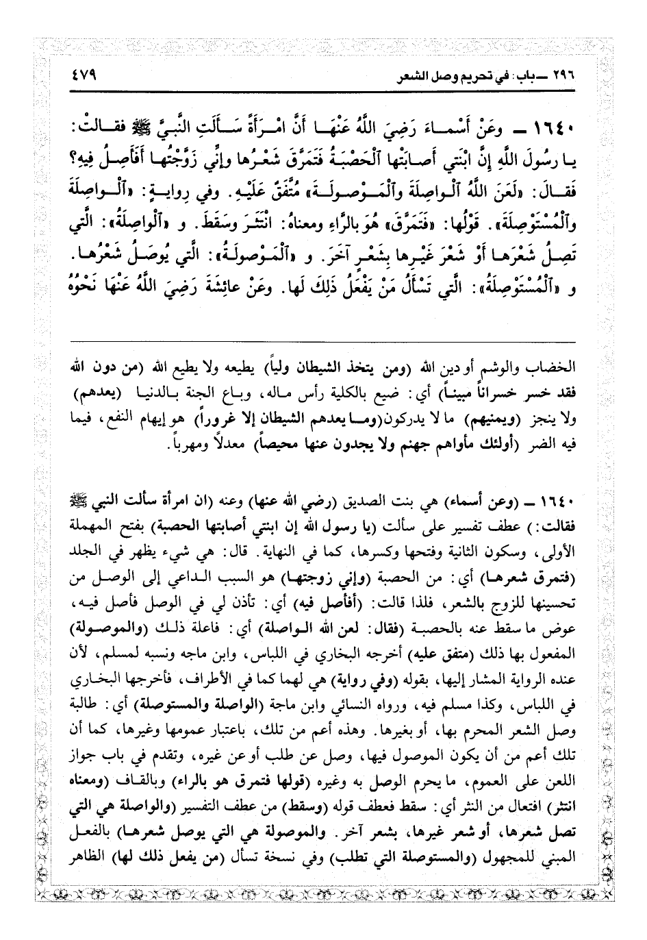 1640- وعن أسماءَ رضي الله عنها: أنَّ امْرَأَةً سَأَلَتِ النَّبيَّ - صلى الله عليه وسلم - فَقَالَتْ: يا رسولَ اللهِ إنَّ ابْنَتِي أصَابَتْهَا الحَصْبَةُ، فَتَمَرَّقَ شَعْرُهَا، وإنّي زَوَّجْتُهَا، أفَأَصِلُ فِيهِ؟ فقالَ: "لَعَنَ اللهُ الوَاصِلَةَ وَالمَوْصُولَةَ". متفق عليه.