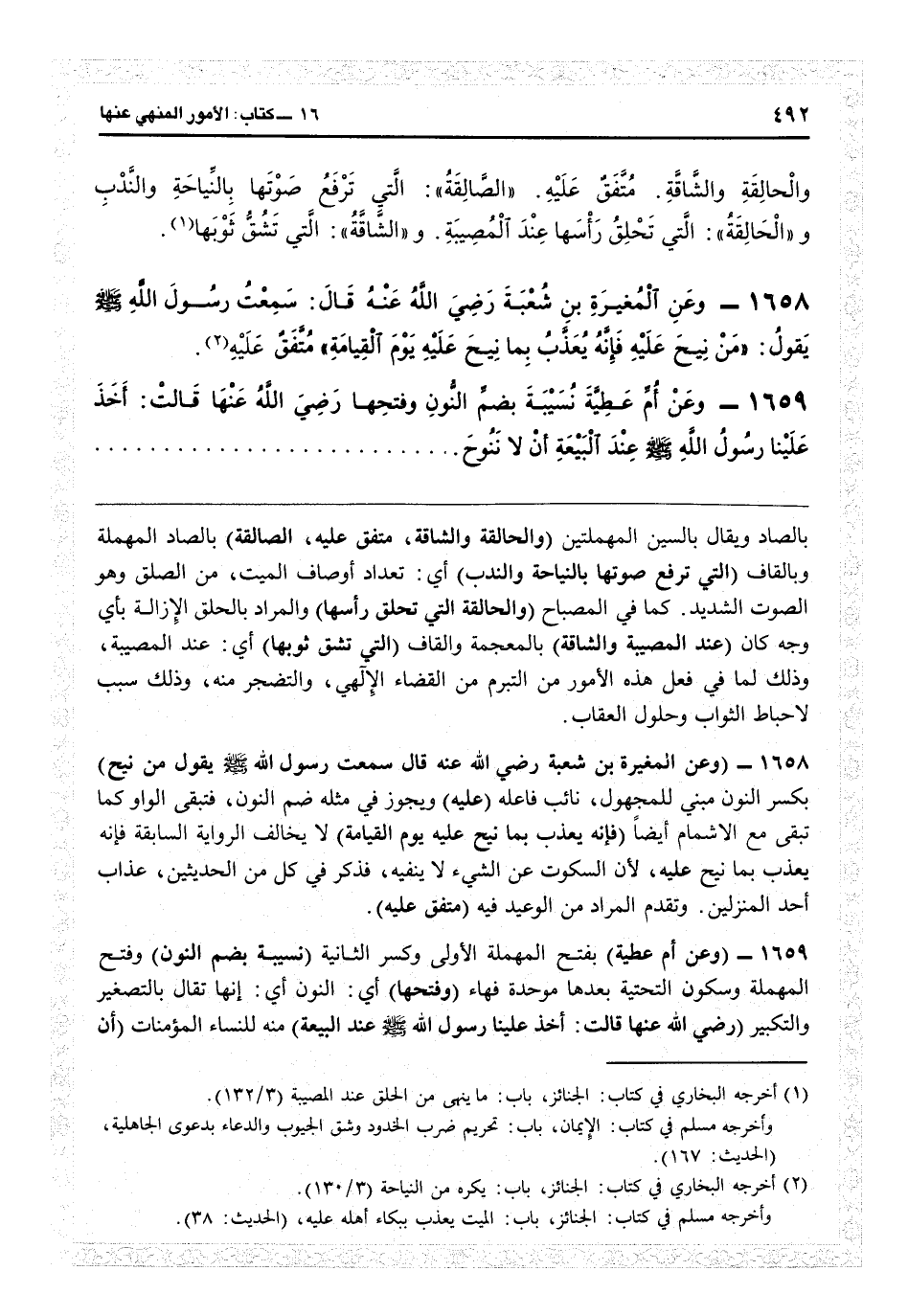 1658- (وعن المغيرة بن شعبة رضي الله عنه قال سمعت رسول الله - صلى الله عليه وسلم - يقول من نيح) بكسر النون مبني للمجهول، نائب فاعله (عليه) ويجوز في مثله ضم النون، فتبقى الواو كما تبقى مع الاشمام أيضاً (فإنه يعذب بما نيح عليه يوم القيامة) لا يخالف الرواية السابقة فإنه يعذب بما نيح عليه، لأن السكوت عن الشيء لا ينفيه، فذكر في كل من الحديثين، عذاب أحد المنزلين. وتقدم المراد من الوعيد فيه (متفق عليه) .