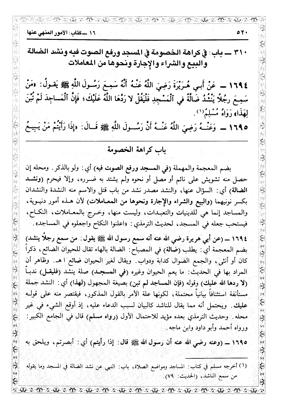 310- باب في كراهة الخصومة في المسجد ورفع الصوت فيه ونشد الضالة والبيع والشراء والإجارة ونحوها من المعاملات